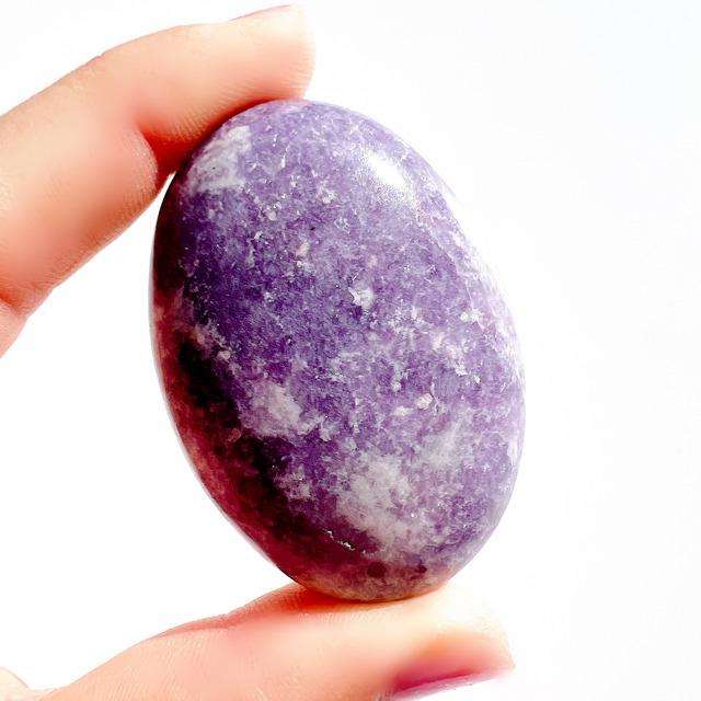 淡い紫色に、細かな輝きが美しいレピドライト・ペブル(握り石)です。 レピドライトは、ギリシャ語で「鱗」を意味する「lepidos(レピドス)」に由来し、内側からきらめくような光を宿す石です。 この石は、「変革の石」とも呼ばれ、人生の転機や新しいステージへ進むとき、変化への不安をやさしく溶かし、心の安定と安心感をもたらすといわれています。 てのひらに収まるペブル型は、握るたびに余分な緊張を手放し、変容のプロセスを緩やかにサポートしてくれるでしょう。 レピドライトのやさしくキラキラした輝きが、「大丈夫、流れに委ねていいよ」そんなメッセージをあなたにそっと届けてくれるでしょう。 変わりゆく今を、やさしく受け入れたい方へ。 瞑想やお守りにおすすめの石です。 レピドライト・ペブル インド産 約39㎜×54㎜×20㎜(最大)