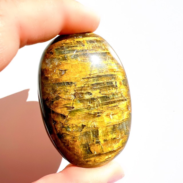ネライトは、近年発見された数種の鉱物が共存するレアでユニークな天然石です。 別名「ハニーストーン」とも呼ばれ、繊維状のクロシドライトに石英が入り込み、鉄分の酸化によって、青、黄色、赤へと表情を変える、奥深い輝きが特徴です。 ネライトは、不安をやわらげ、前向きな向上心を高め、迷いや混乱を手放し、目標へ進む力をサポートするといわれています。 手のひらに収まるペブル型は、お守りとして持ち歩いたり、気持ちを整えたい時にそっと握るのもおすすめです。 ネライト・ペブル ナミビア産 約40㎜×58㎜×20㎜(最大)