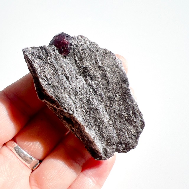 ガーネットinマイカは、情熱と実りを象徴するガーネットと、包み込み守るエネルギーを持つマイカ(雲母)が、ひとつの原石の中で共存する、非常に美しい鉱物のひとつです。 異なる個性が調和しながら存在している姿は、「自分らしさを大切にしながら、周囲と調和して生きる」そんなメッセージを私たちに伝えてくれます。 お部屋に置くだけで、空間に落ち着きと安定感をもたらし、自分自身と深くつながるサポートをしてくれるでしょう。 鉱物好きの方はもちろん、自然のエネルギーを感じたい方、自分軸を整えたい方におすすめです。 ガーネットinマイカ① アラスカ産 約36㎜×59㎜×20㎜(最大)