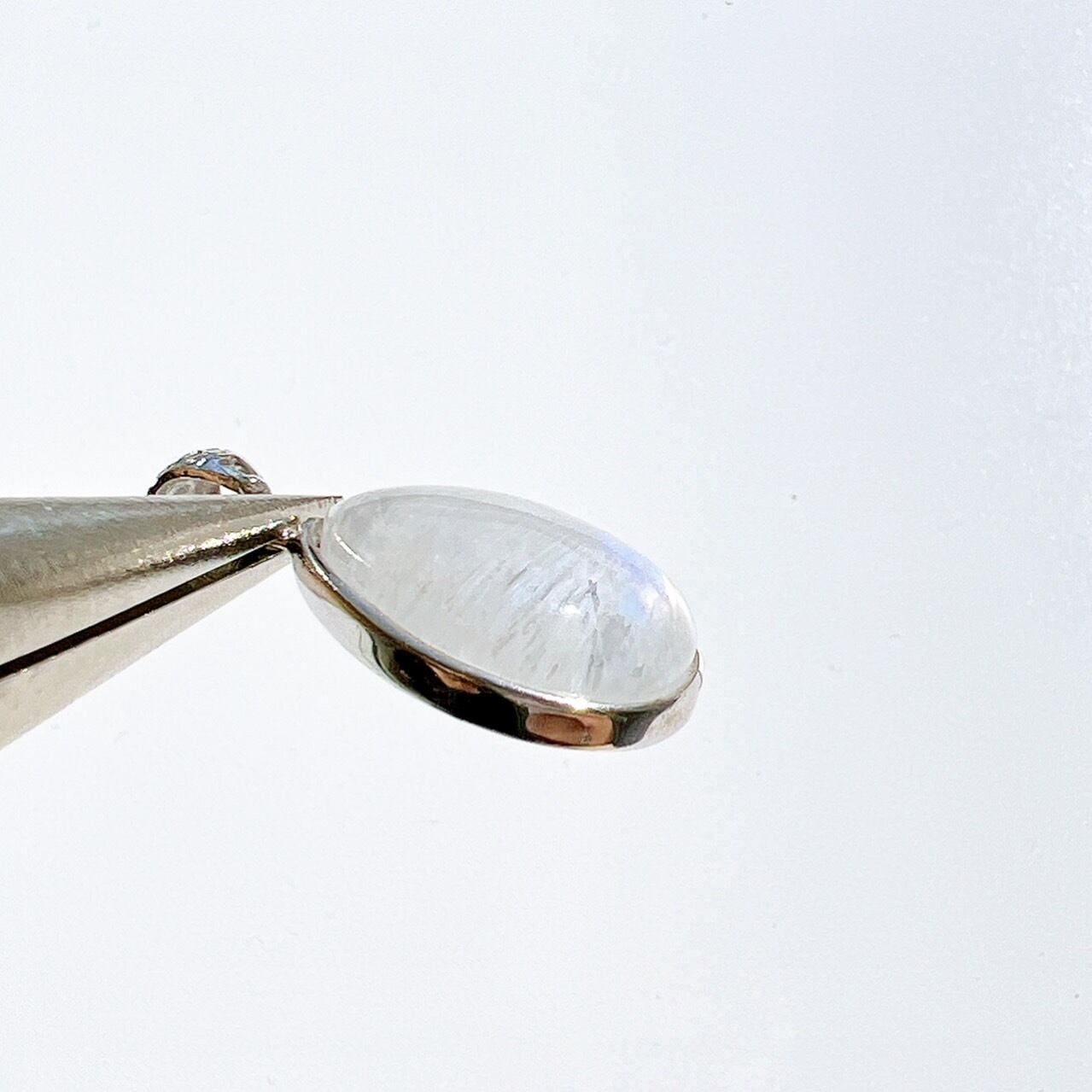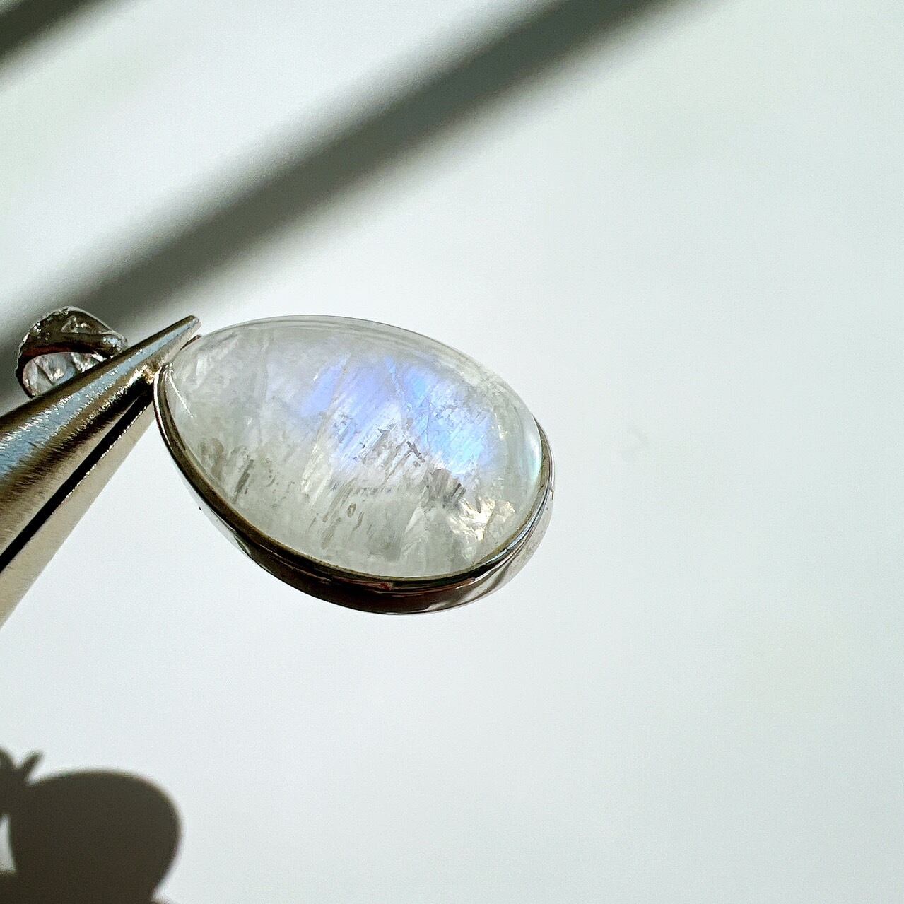 見る角度で、神秘的なブルーのシラー効果が見られるブルームーンストーンのしずく型ペンダントトップです。