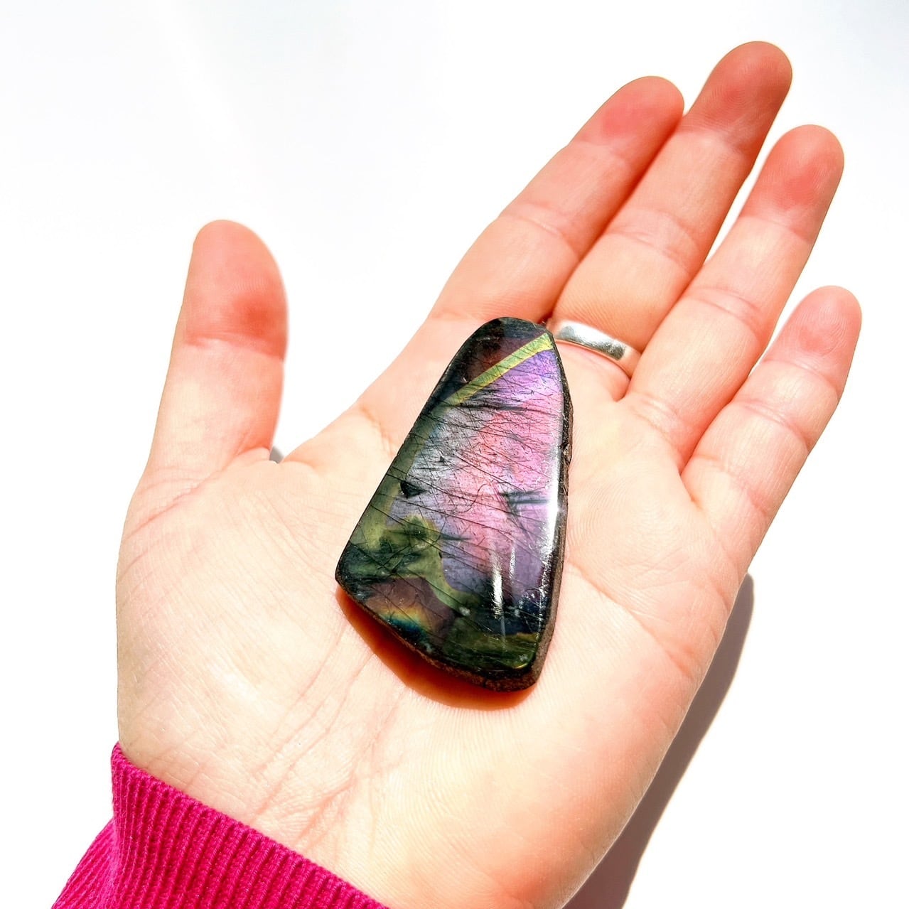 スペクトロライトは、フィンランドで産出されるラブラドライトの一種で、ベースの色が黒色で、見る角度によって、主にマゼンタ色の入った美しい玉虫色のようにみえる石です。