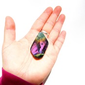 スペクトロライトは、フィンランドで産出されるラブラドライトの一種で、ベースの色が黒色で、見る角度によって、主にマゼンタ色の入った美しい玉虫色のようにみえる石です。