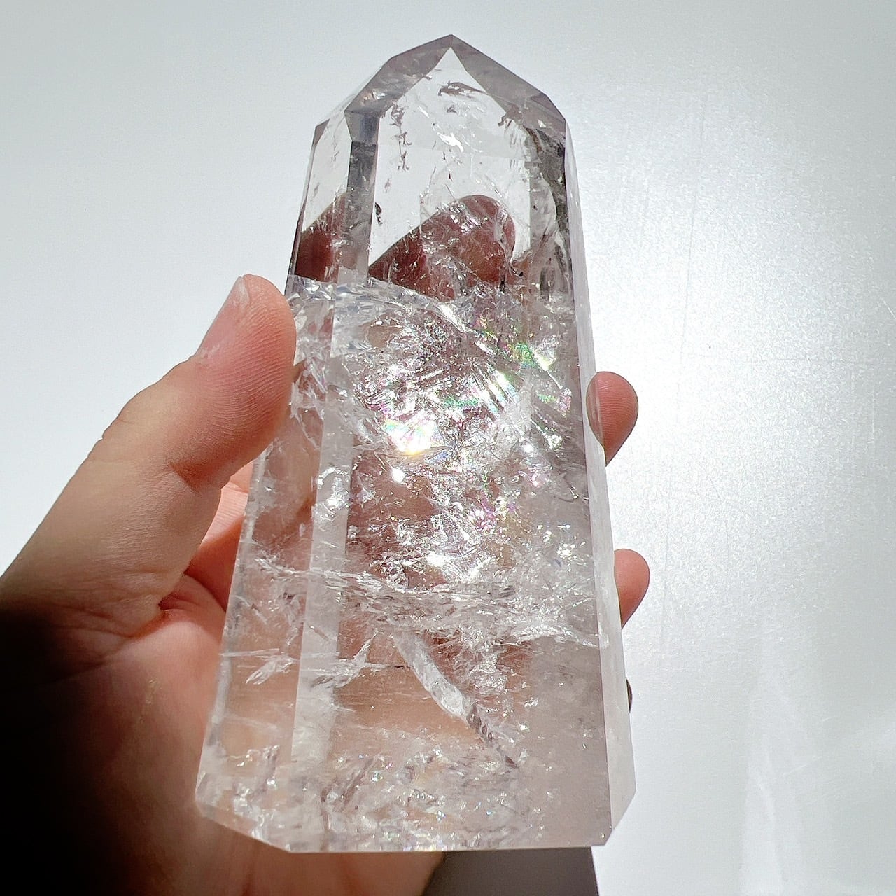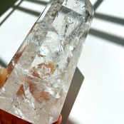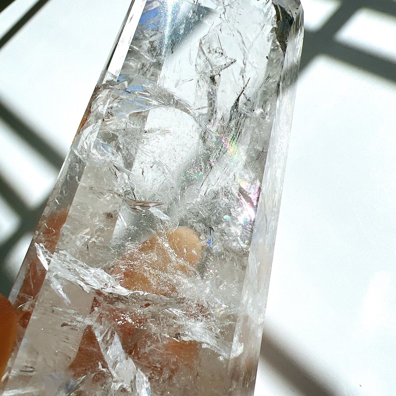このポイントは、全体的に自然なクラックが入ることで虹もたくさん見え、角に赤オレンジ色の内包物が入っているユニークなレムリアン水晶です。