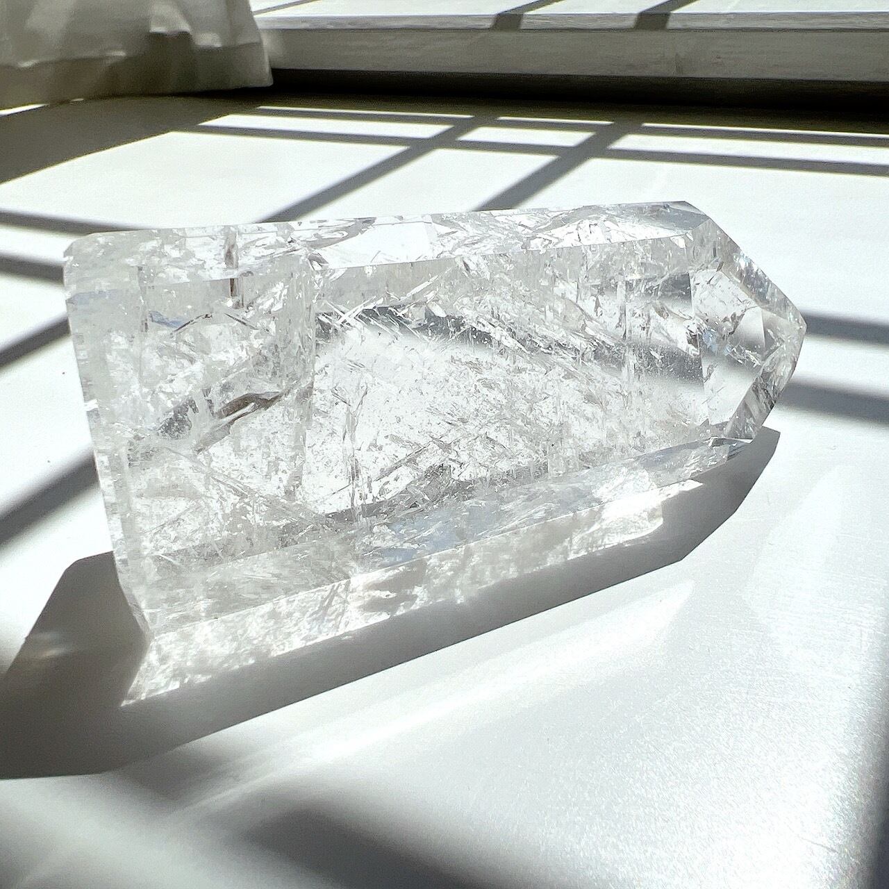 このポイントは、全体的に斜めにクラックが入ることでキラキラと輝くように見え、下部分には虹もたくさん入っているレムリアン水晶です。