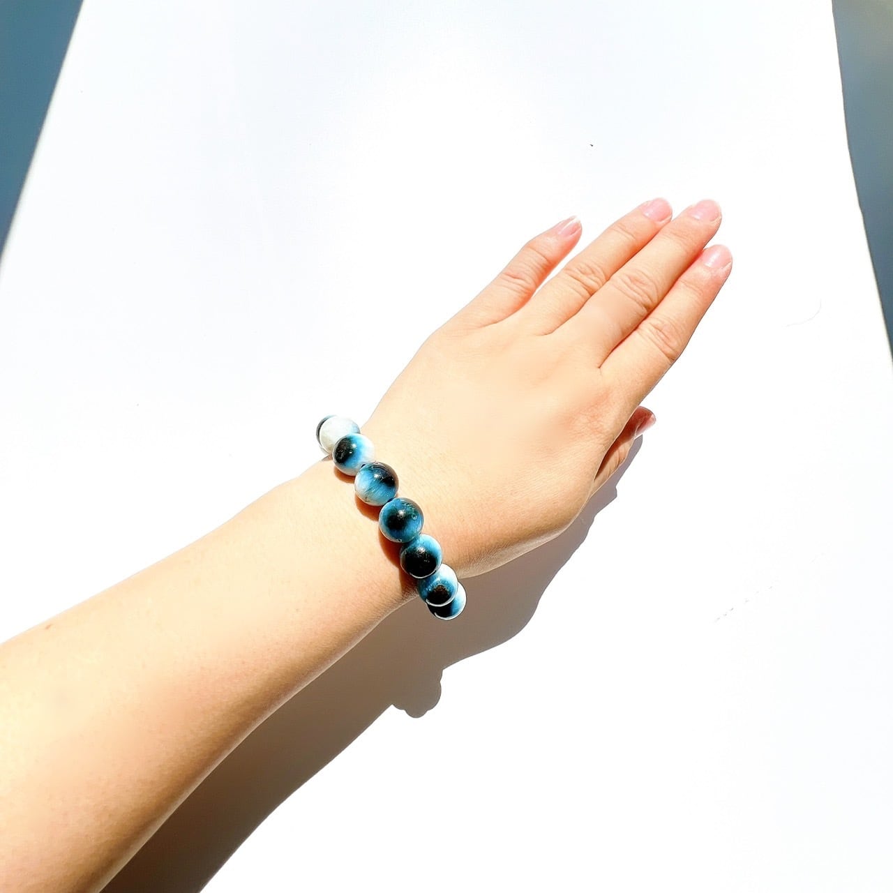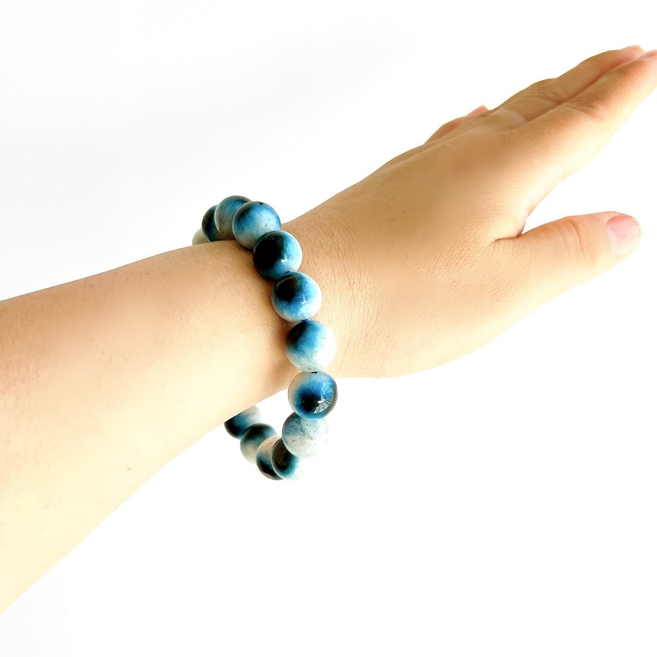 近年見つかり、まだ産出量が少ないと言われるグラシエライトのブレスレットです。グレイシアライトは、美しい青白い結晶が特徴で、氷河を思わせることからこの名前が付けられました。グレイシエライトは半人工石です。