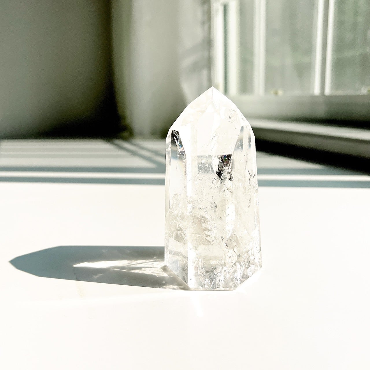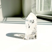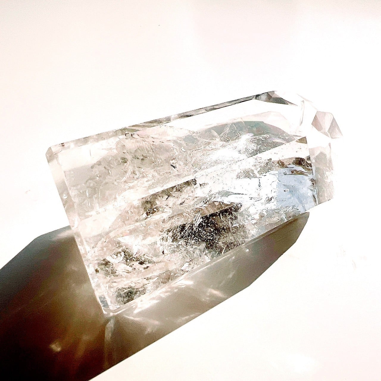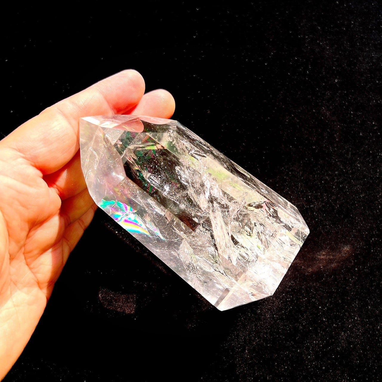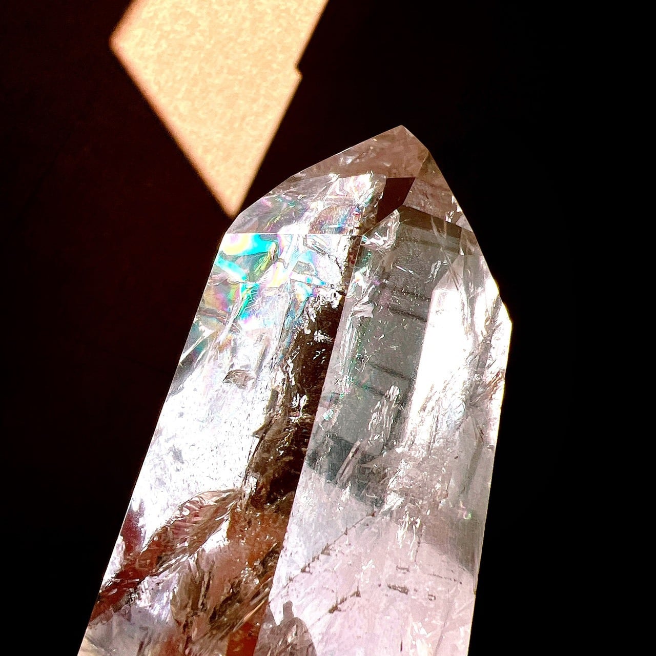 このポイントは、全体的に非常に透明感があり、自然なクラックが入ることで大きな虹も見られる美しいレムリアン水晶です。