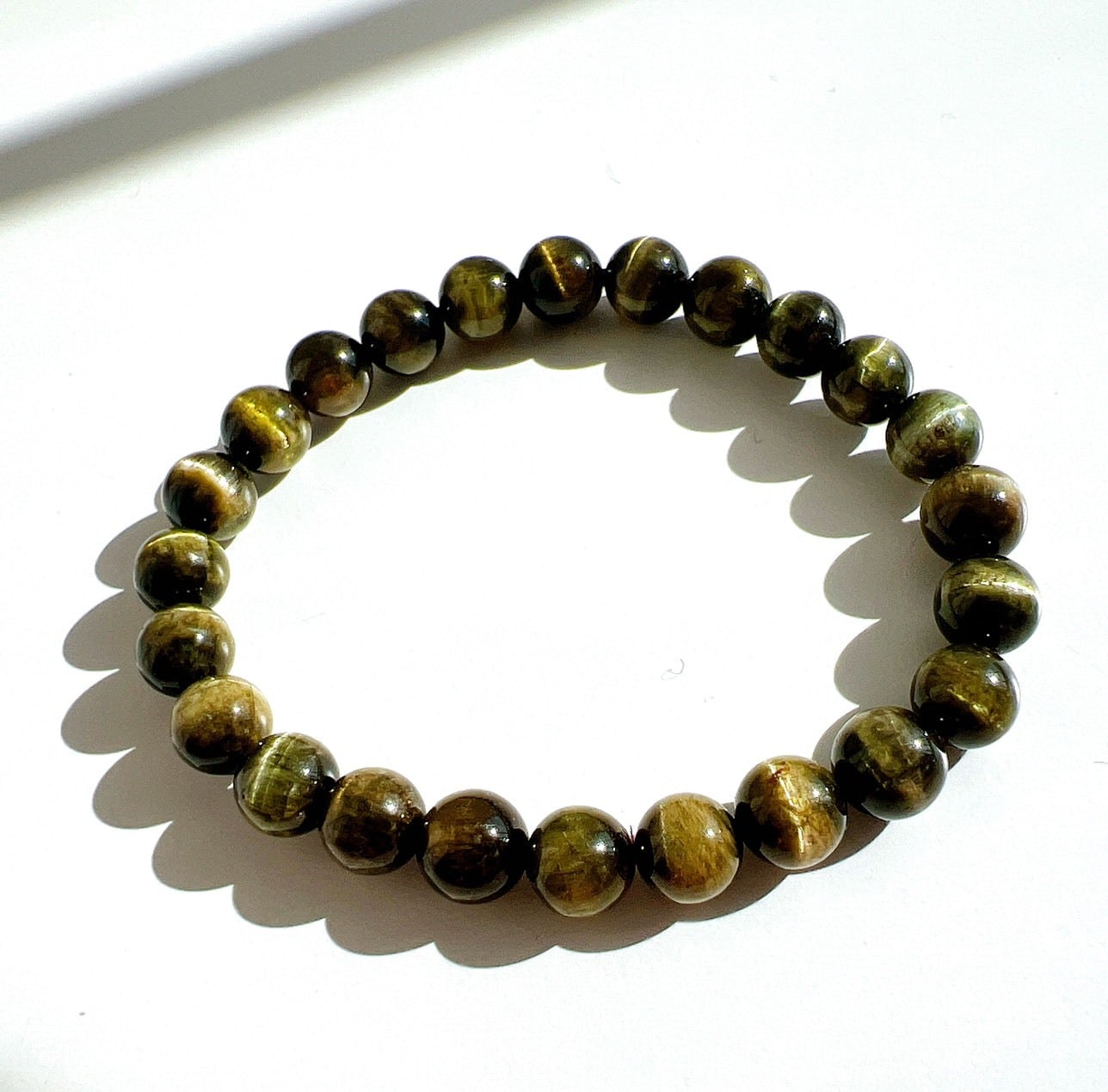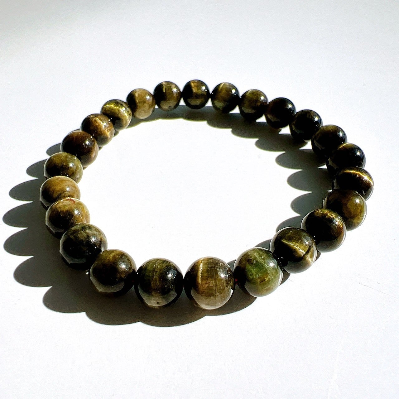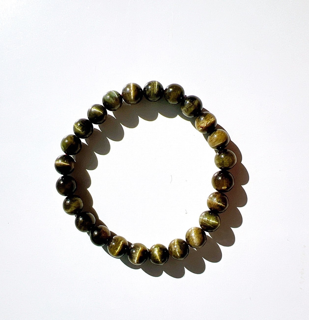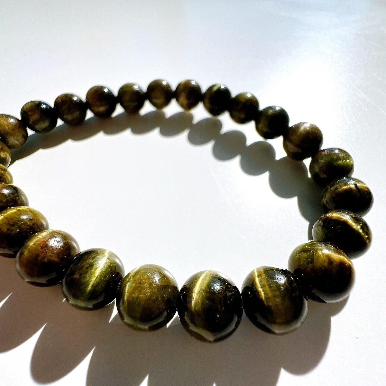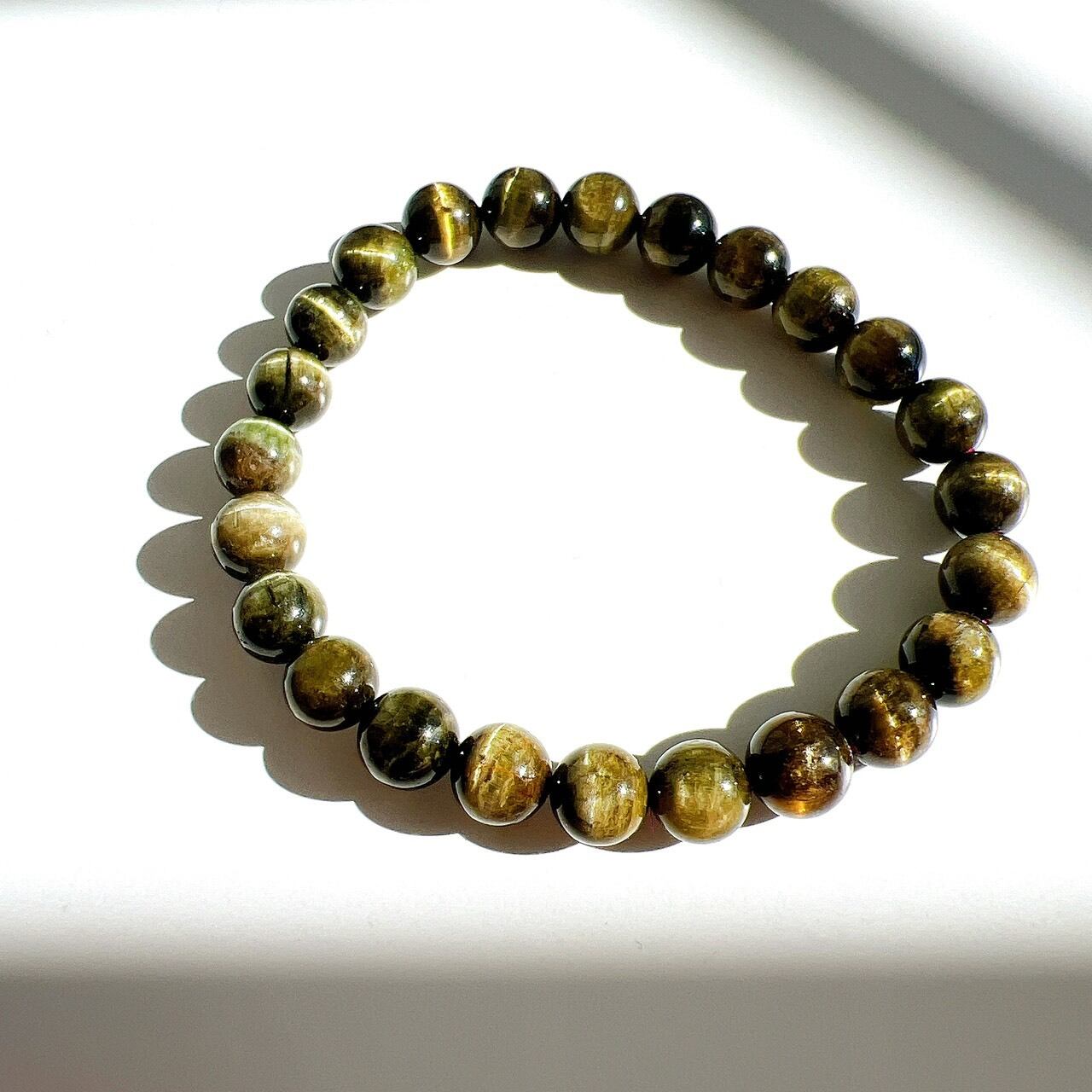 深いグリーンのベースをぐるりと囲むように輝く縦ラインのキャッツ効果が美しいグリーンキャッツアイトルマリンブレスレットです。