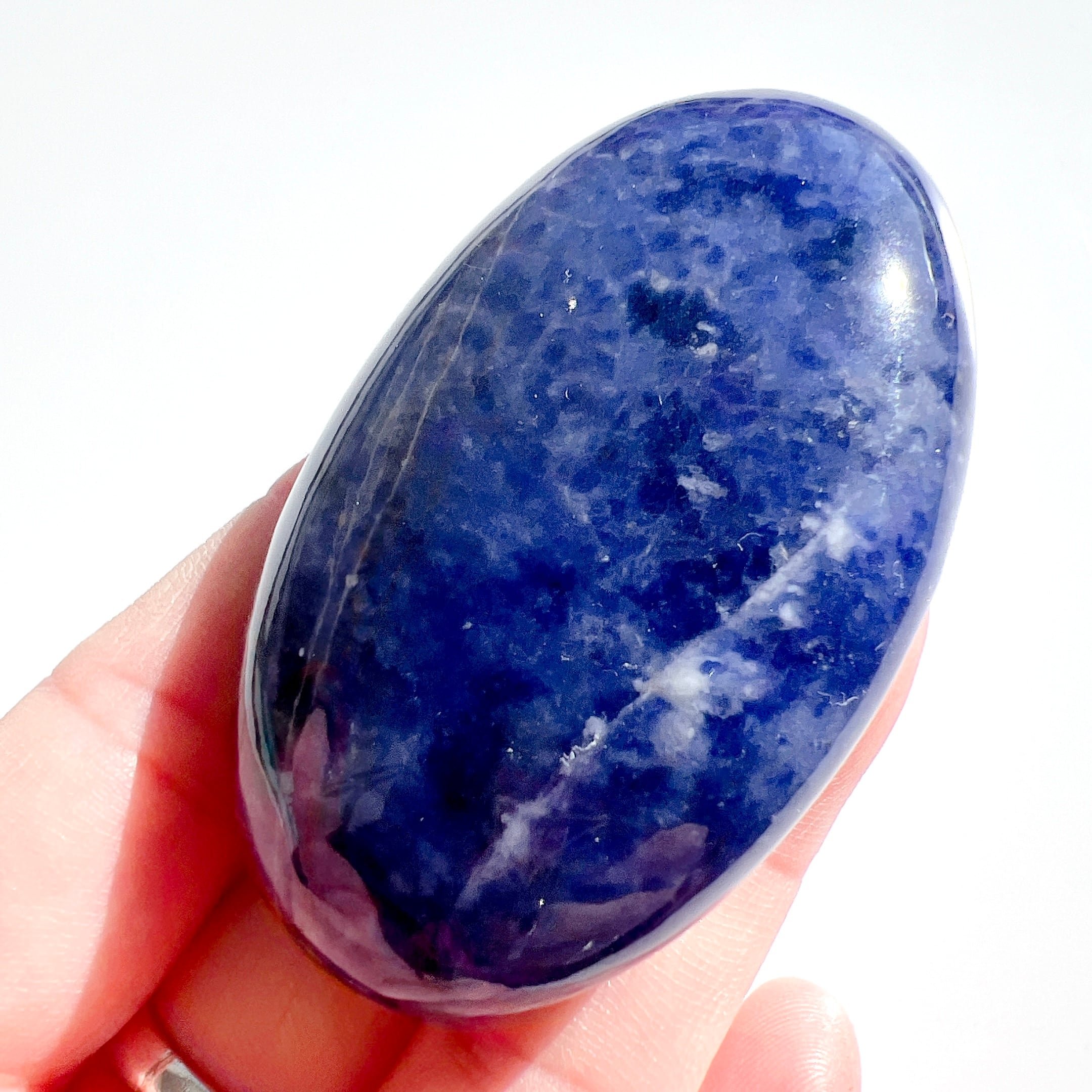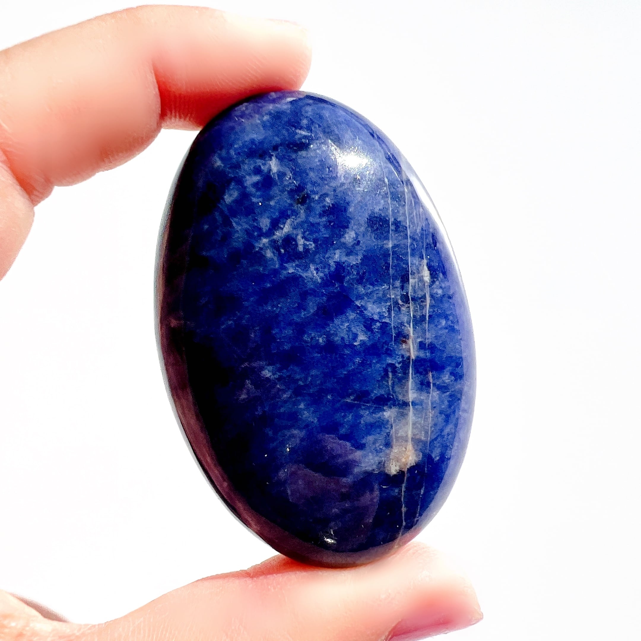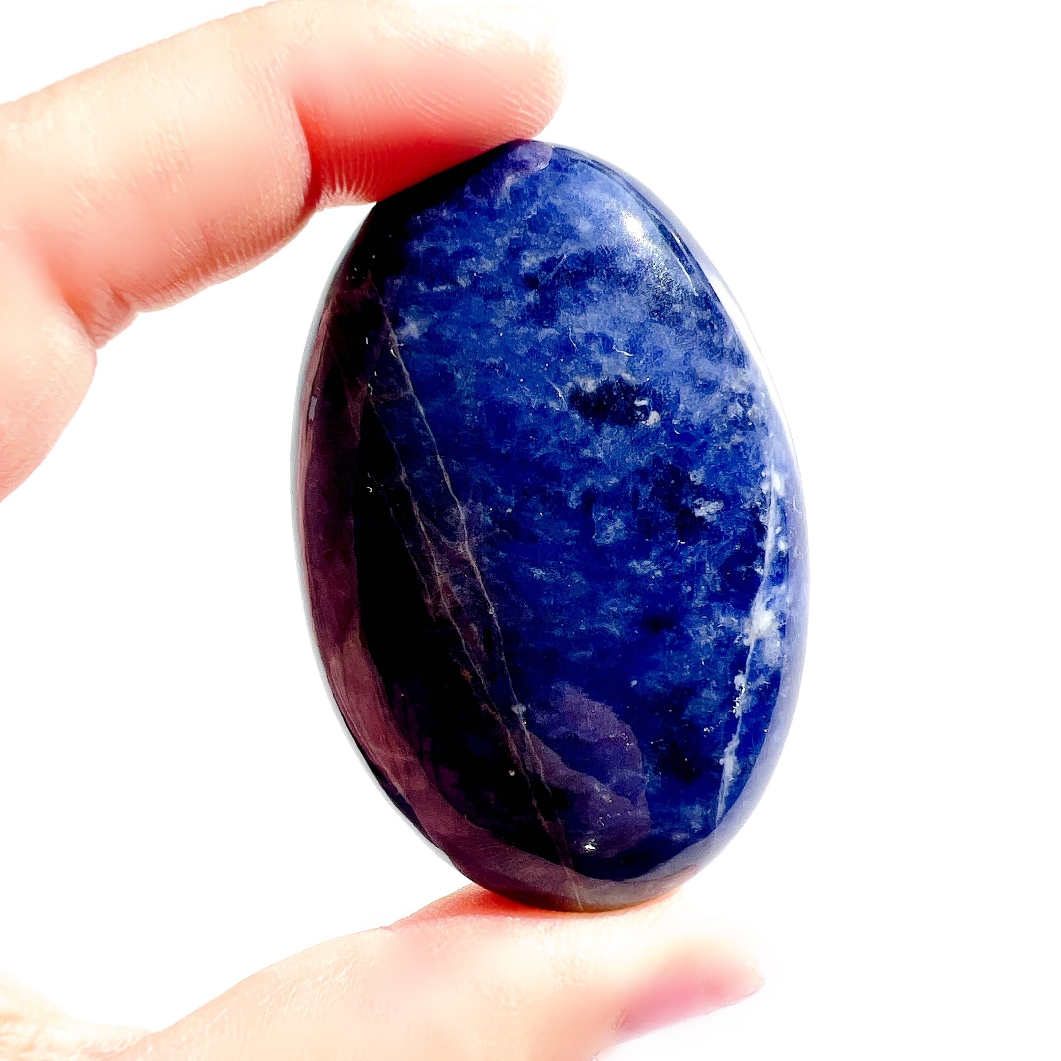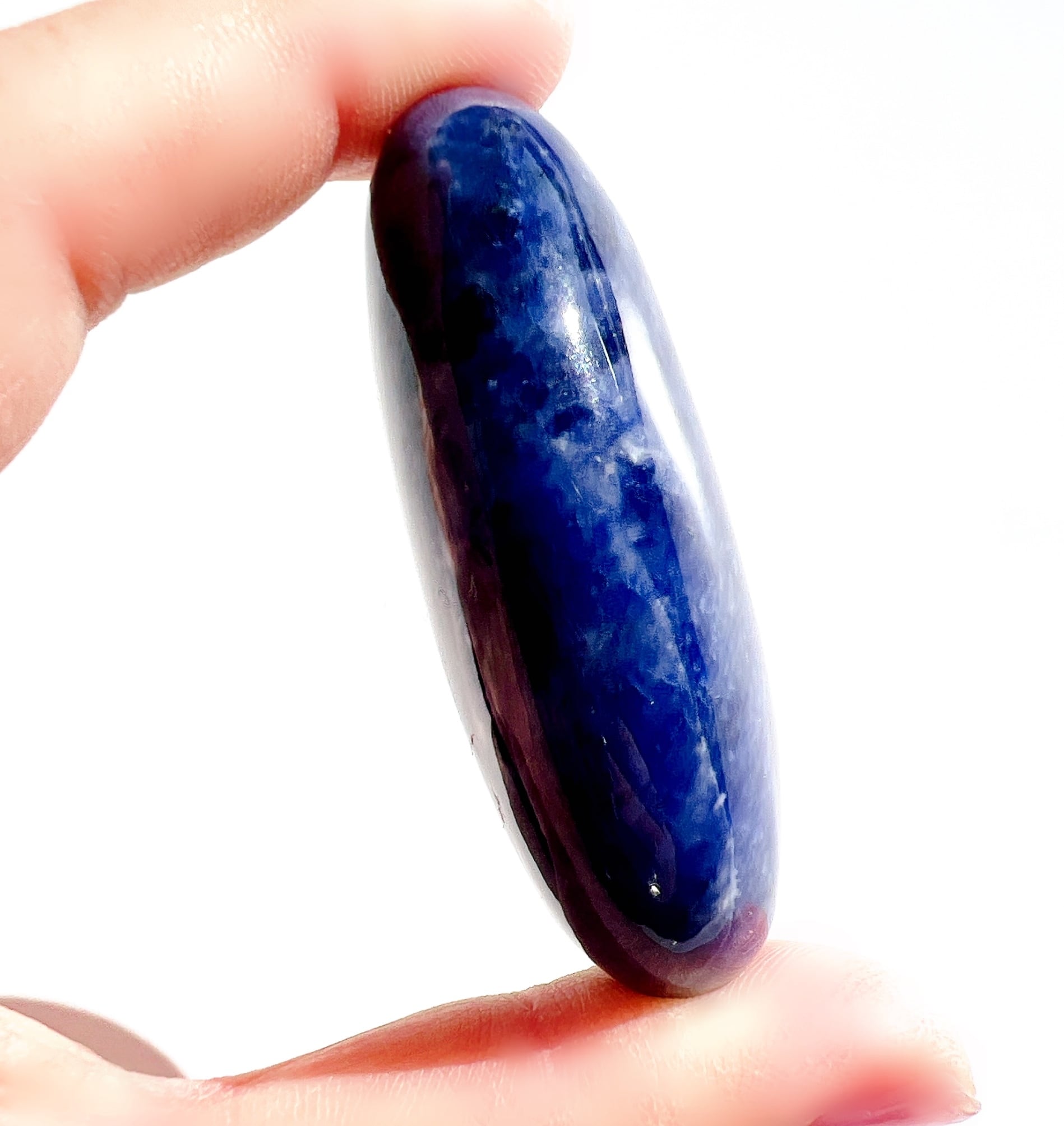 手のひらにすっとなじむ、なめらかなペブル(握り石)のソーダライトです。
