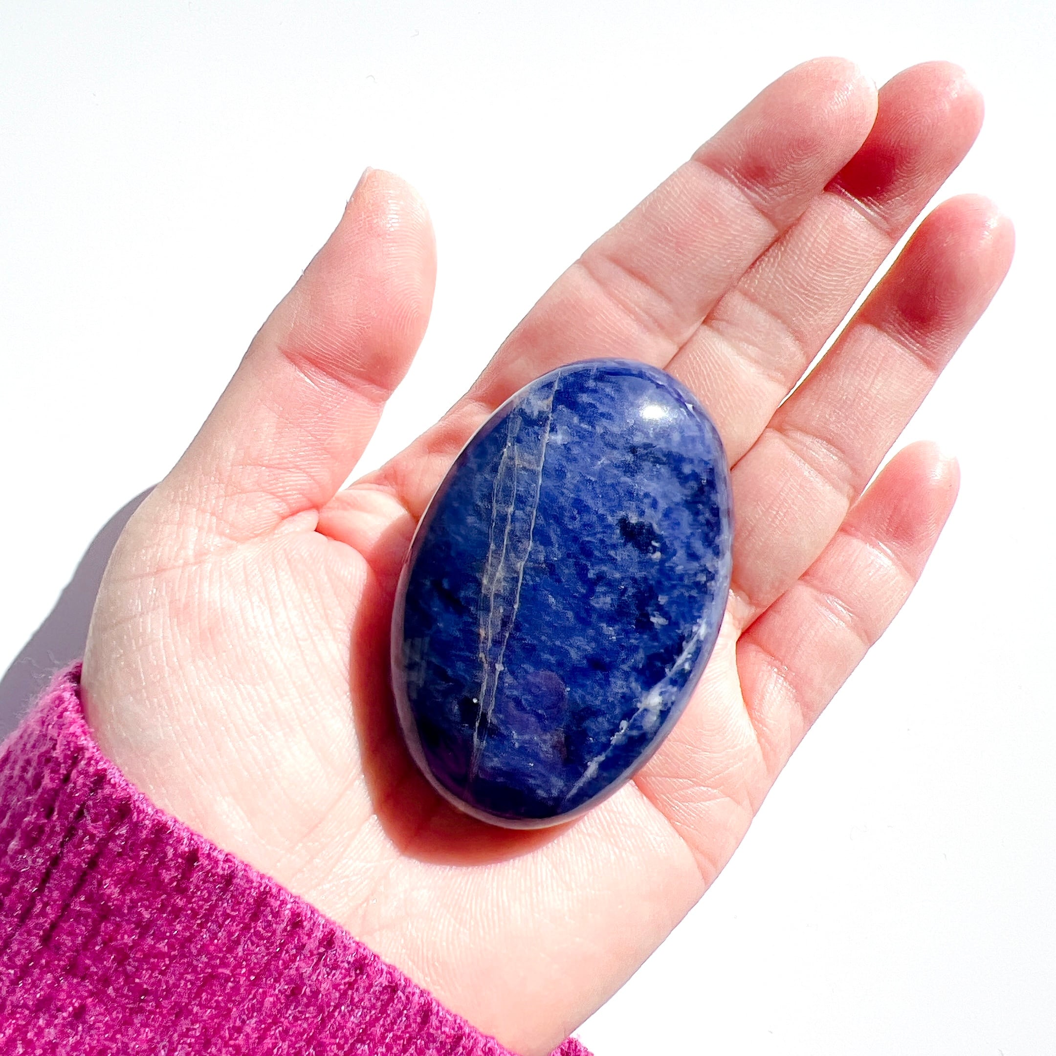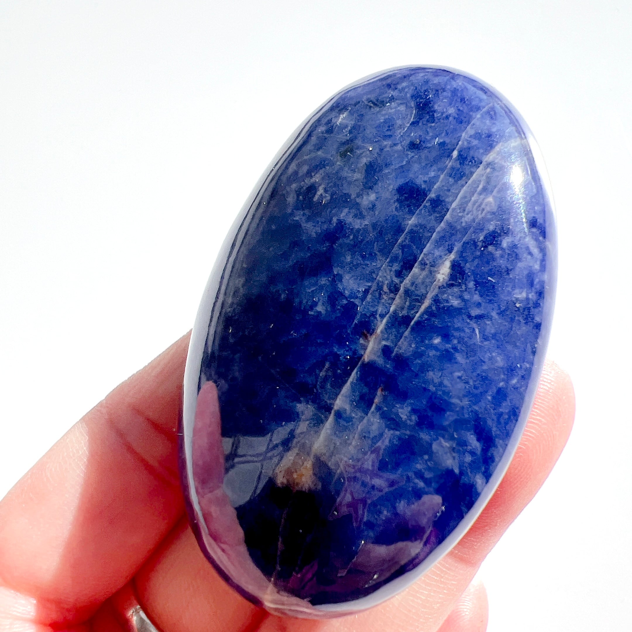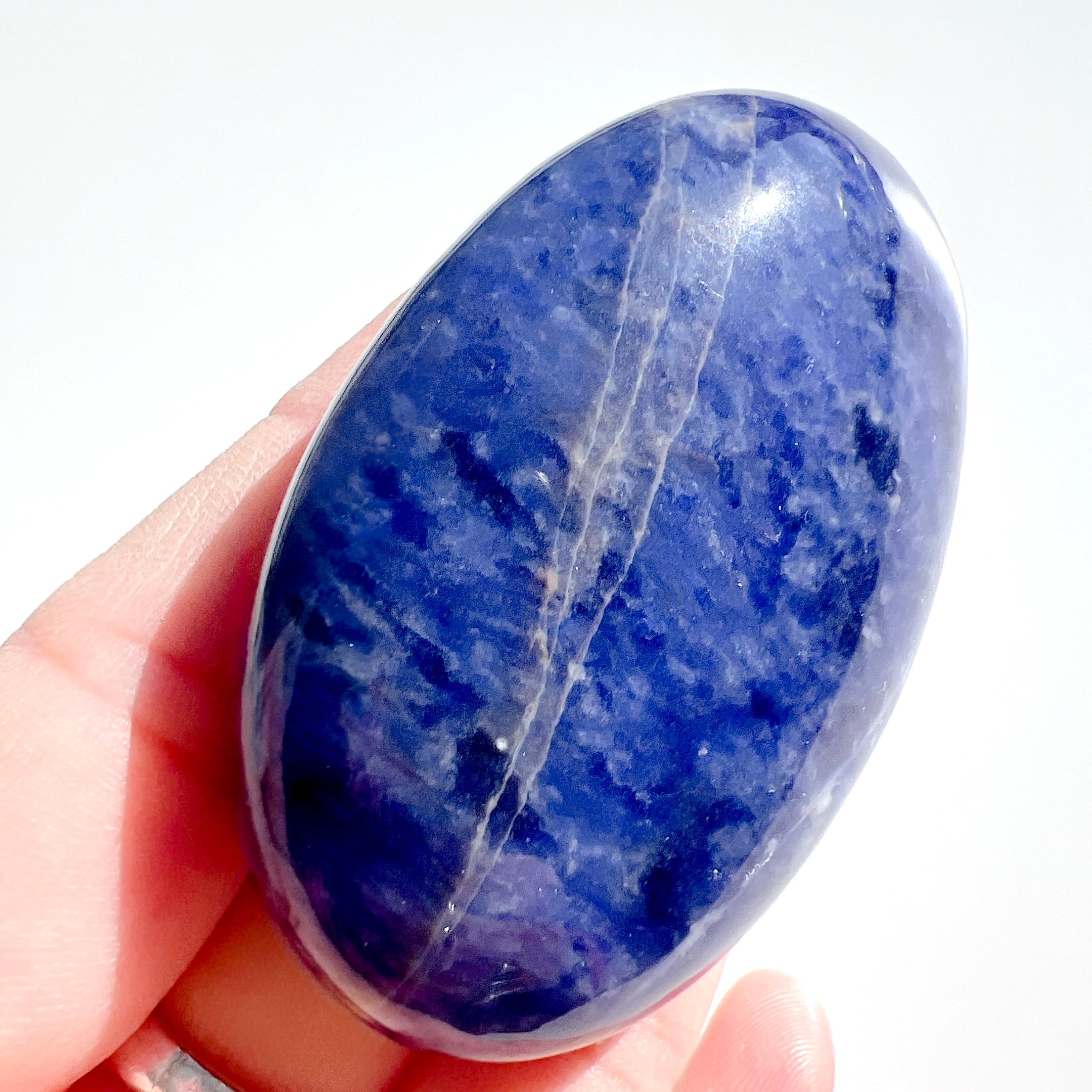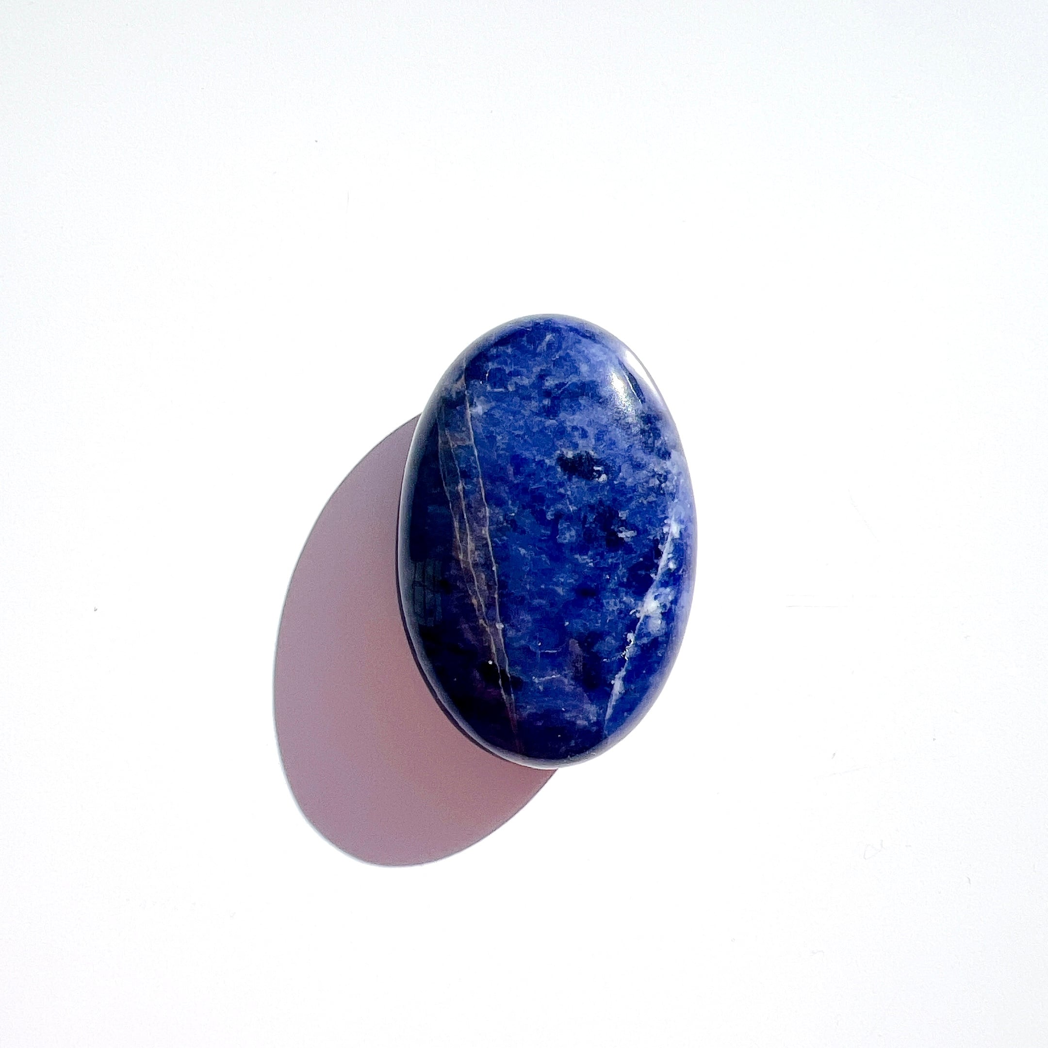 手のひらにすっとなじむ、なめらかなペブル(握り石)のソーダライトです。