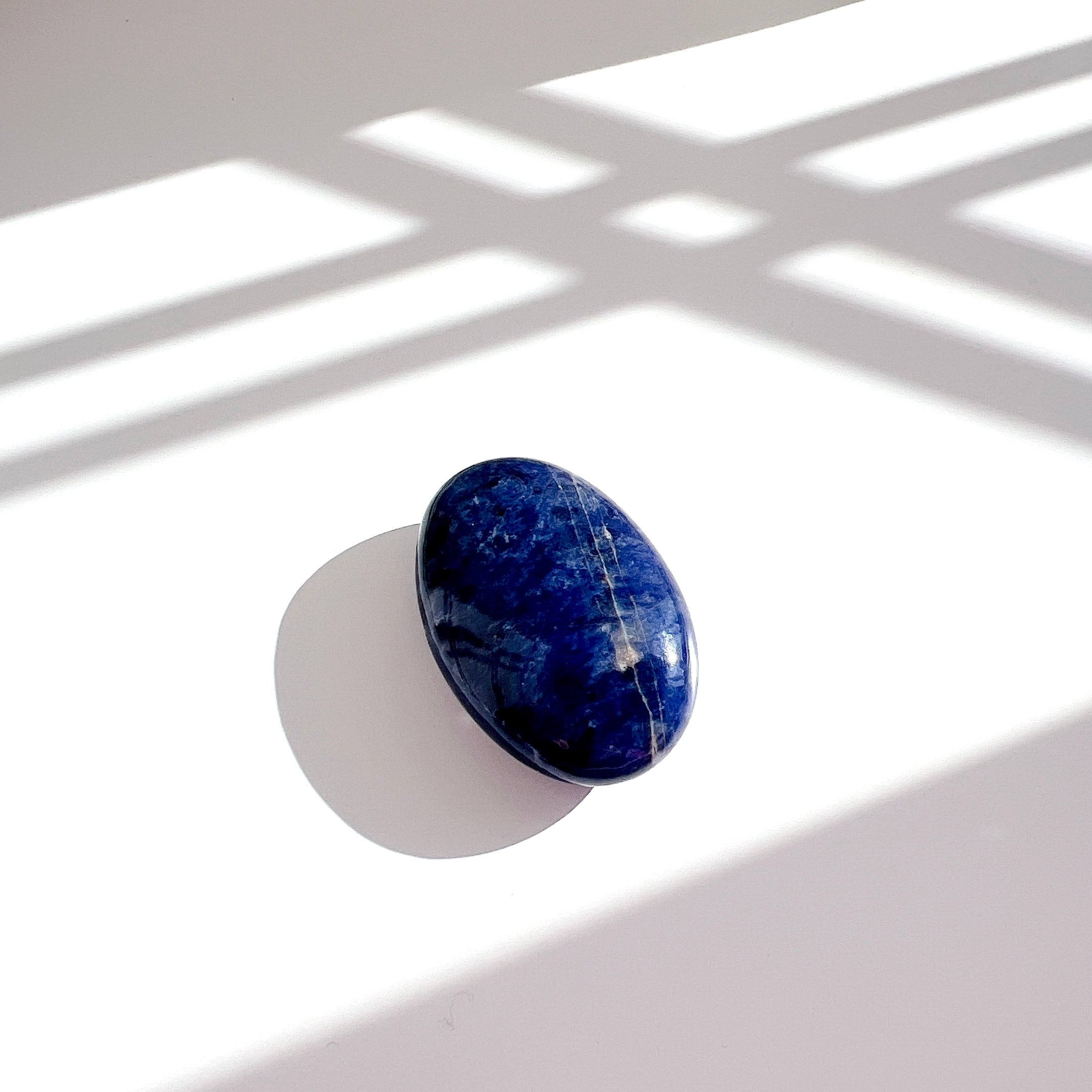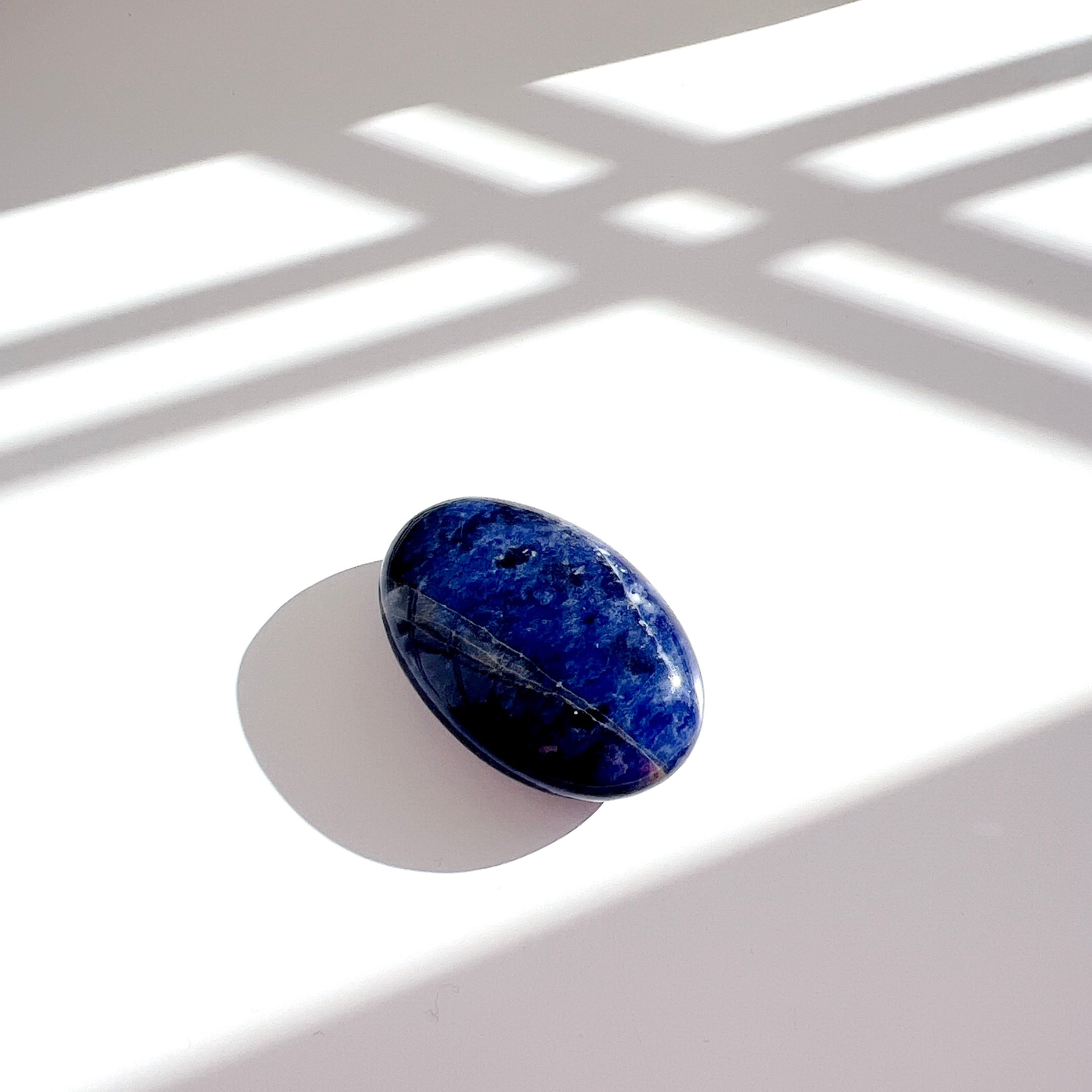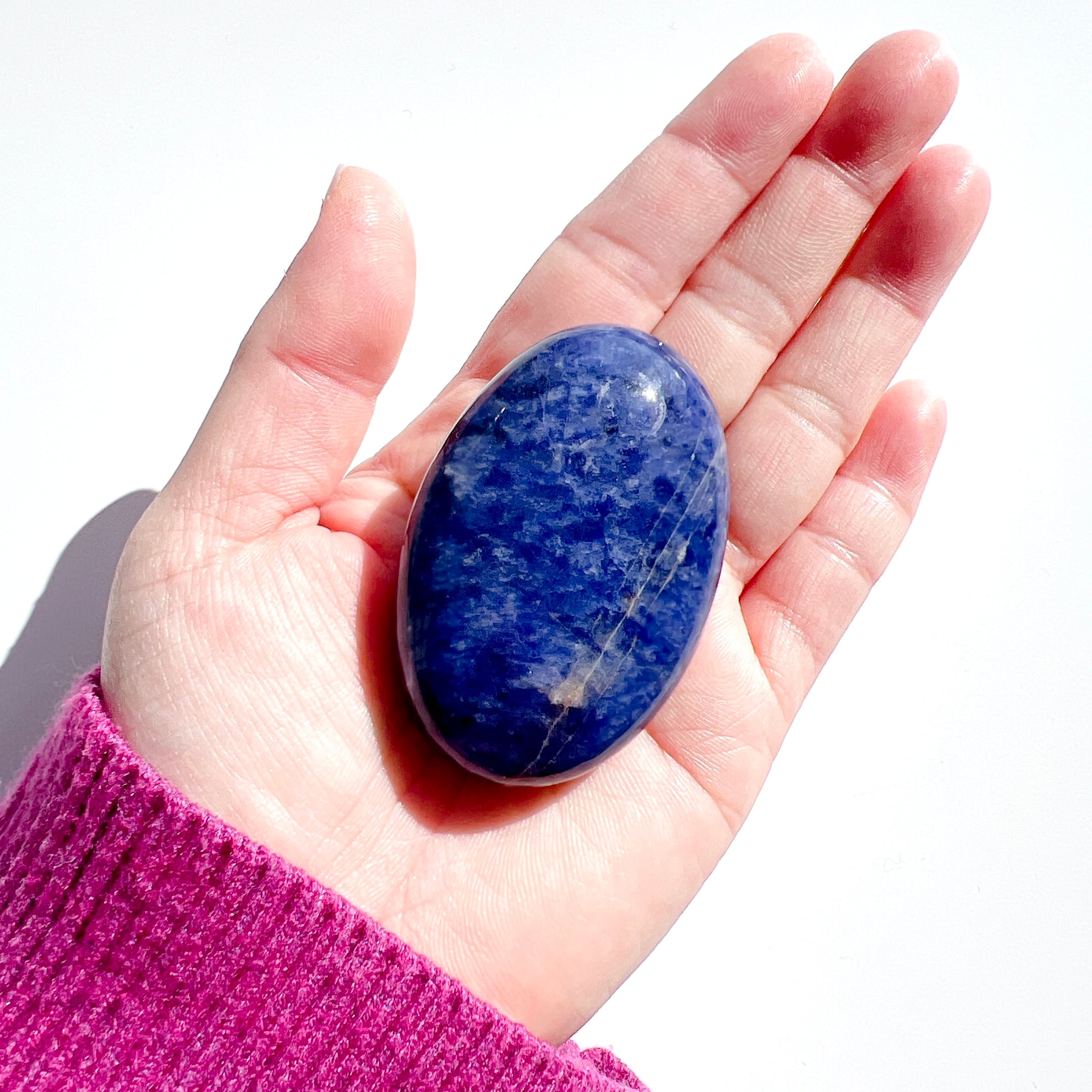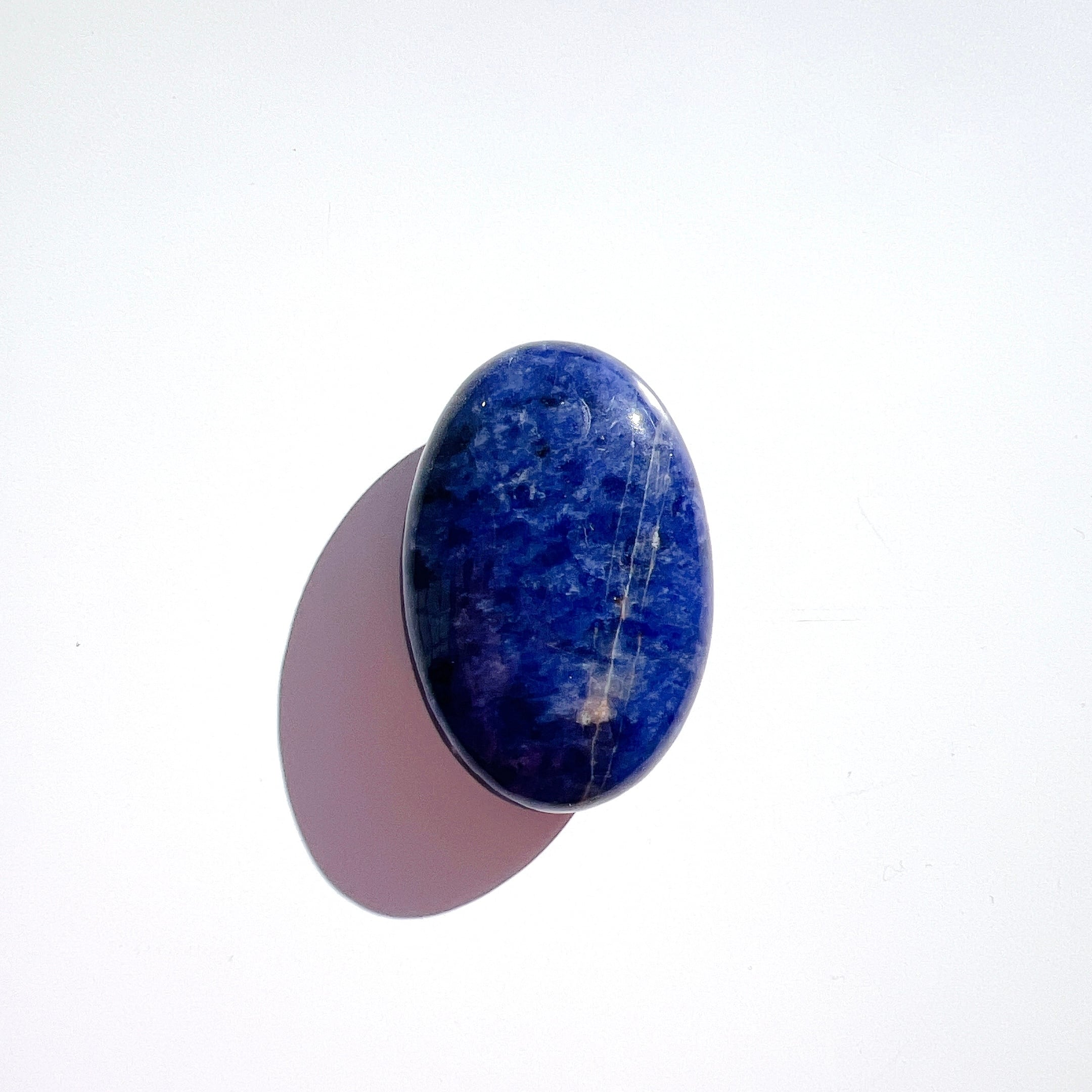手のひらにすっとなじむ、なめらかなペブル(握り石)のソーダライトです。