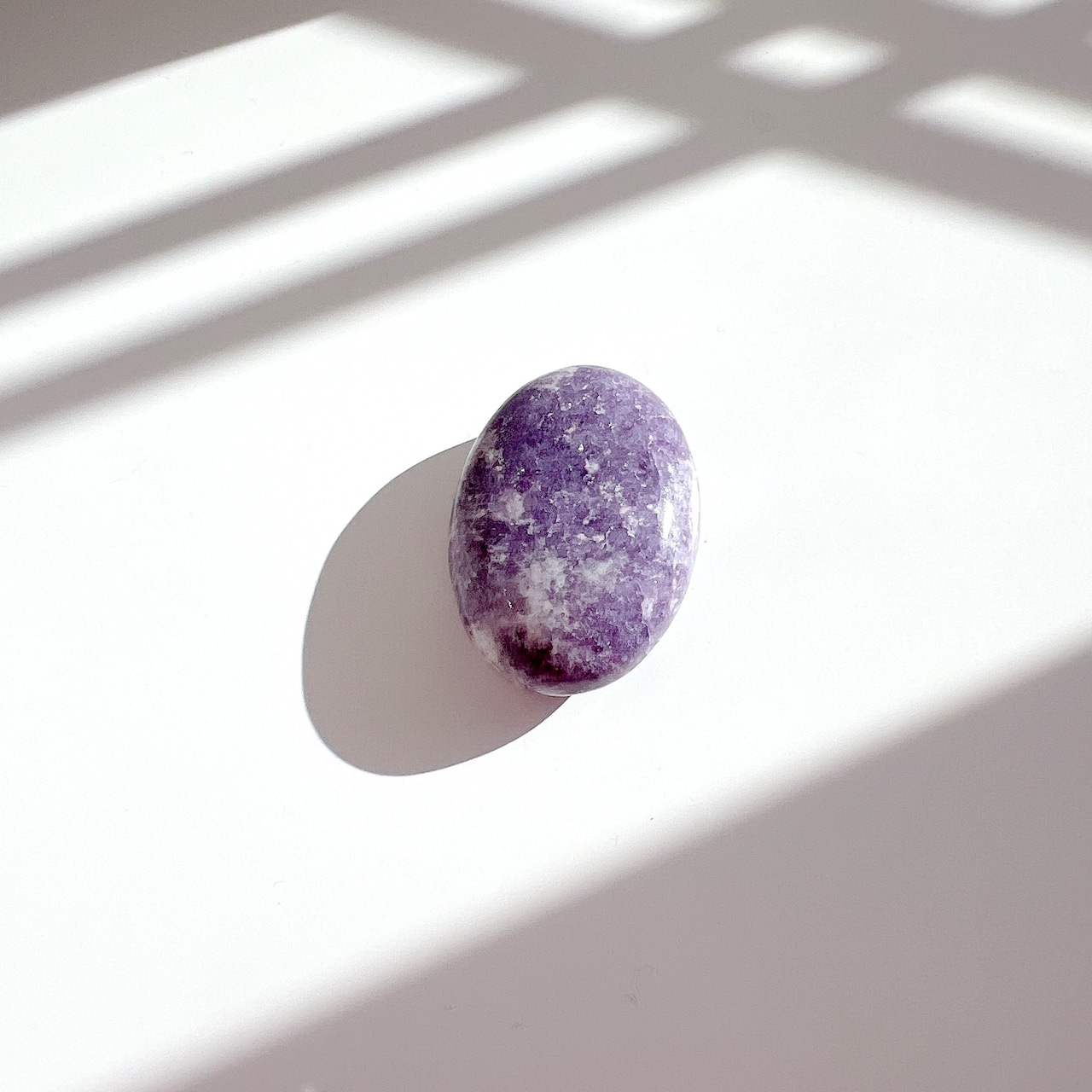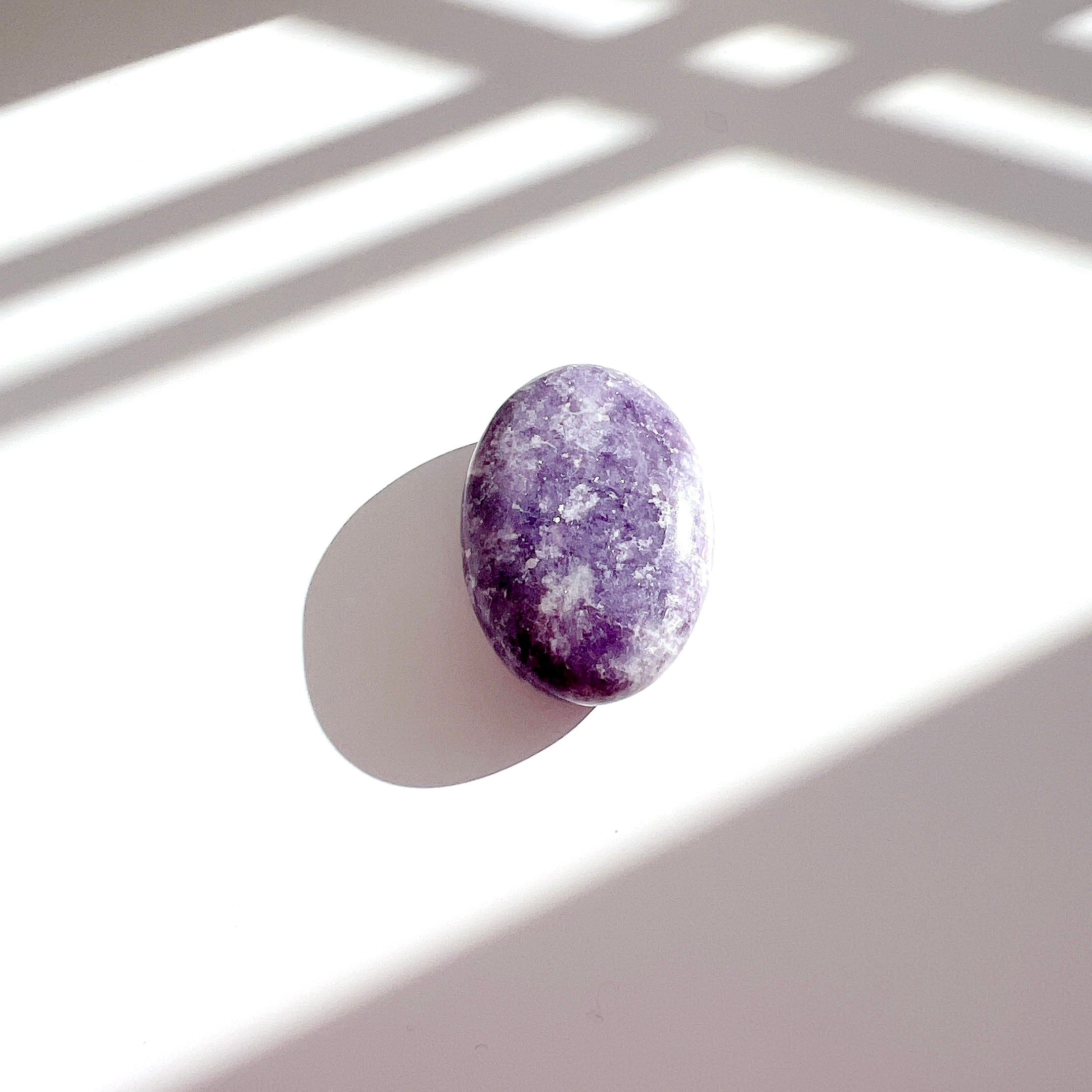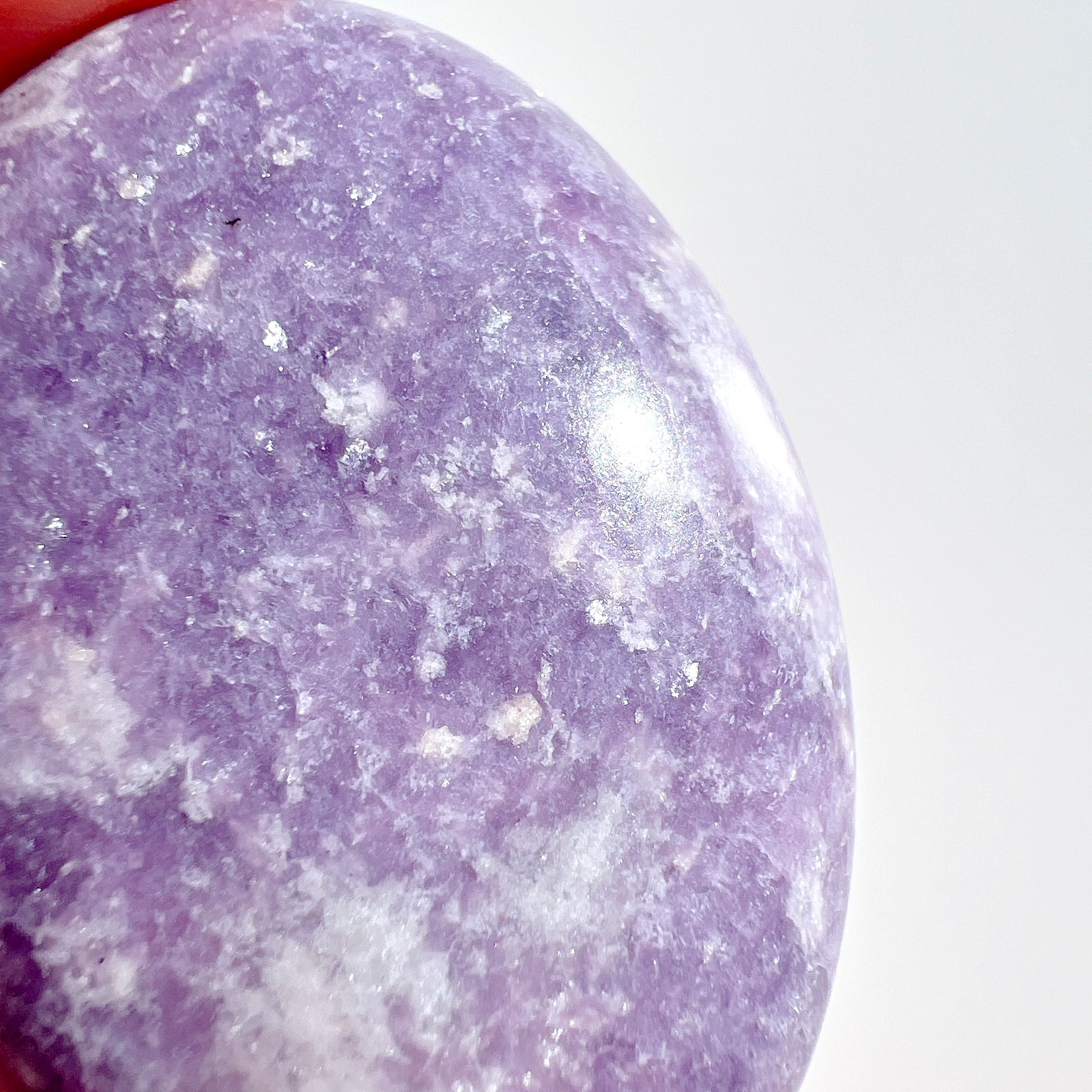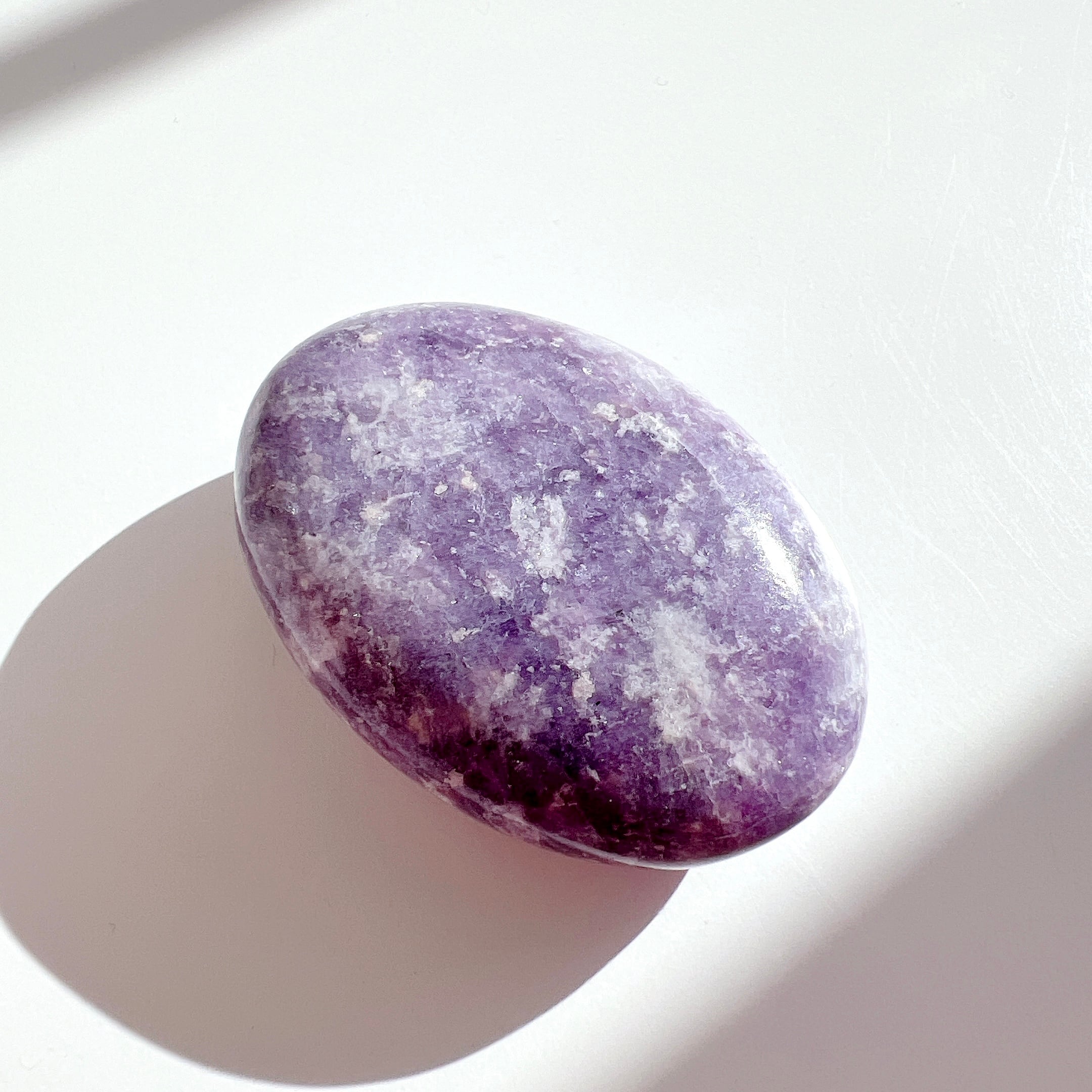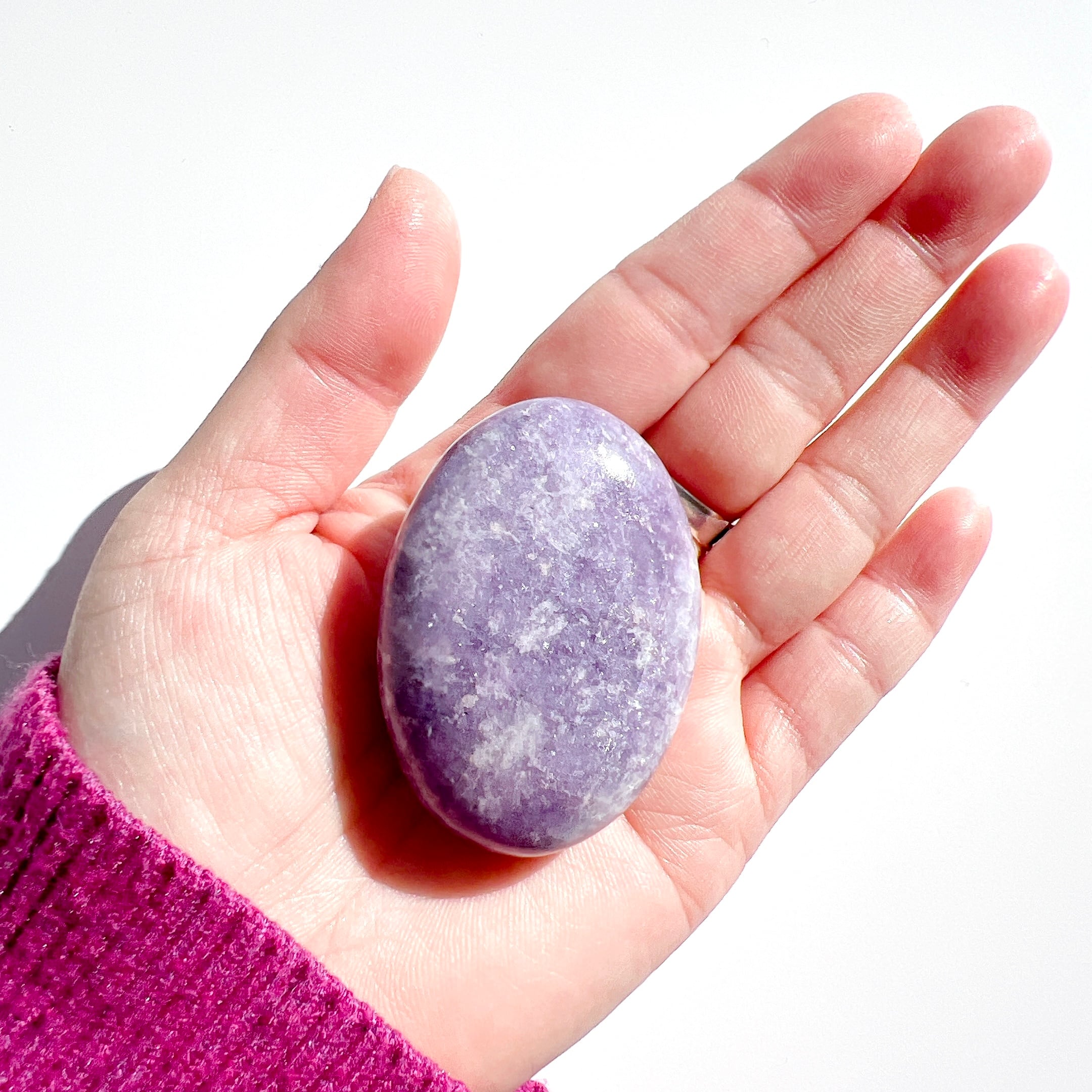 淡い紫色に、細かな輝きが美しいレピドライト・ペブル(握り石)です。