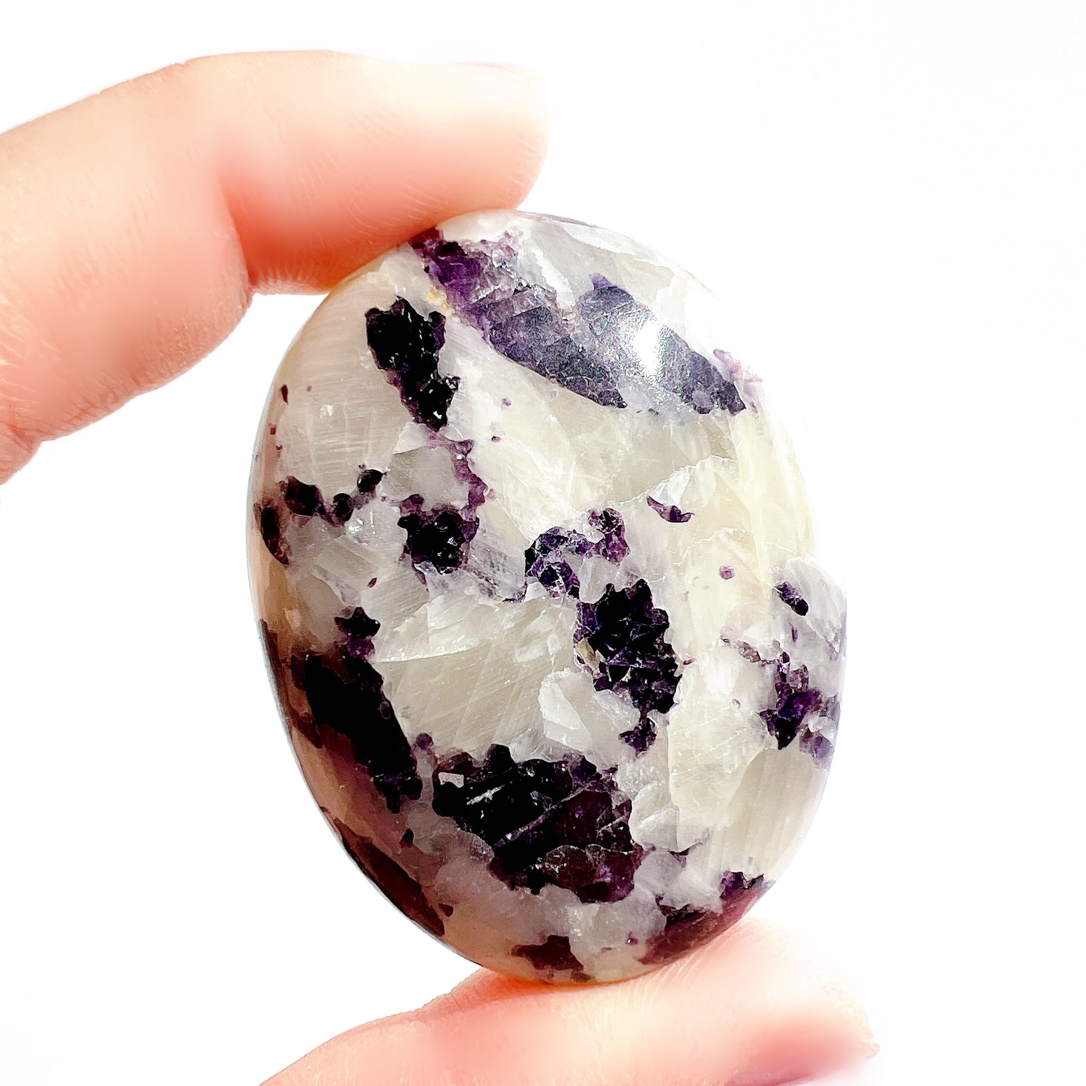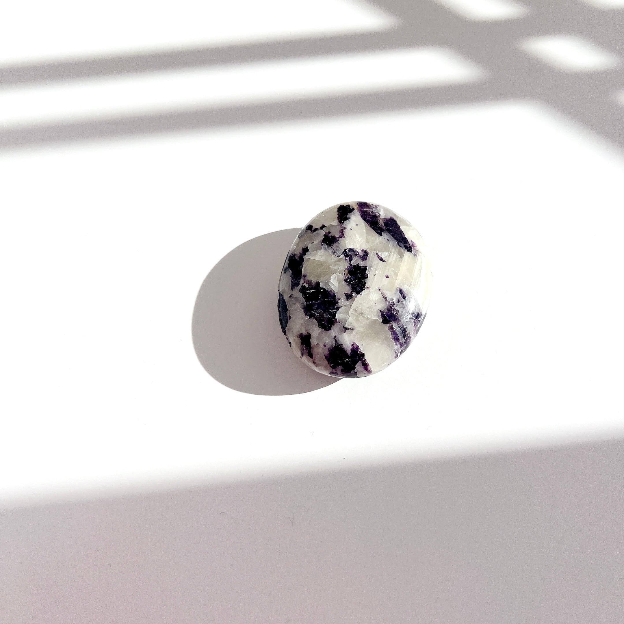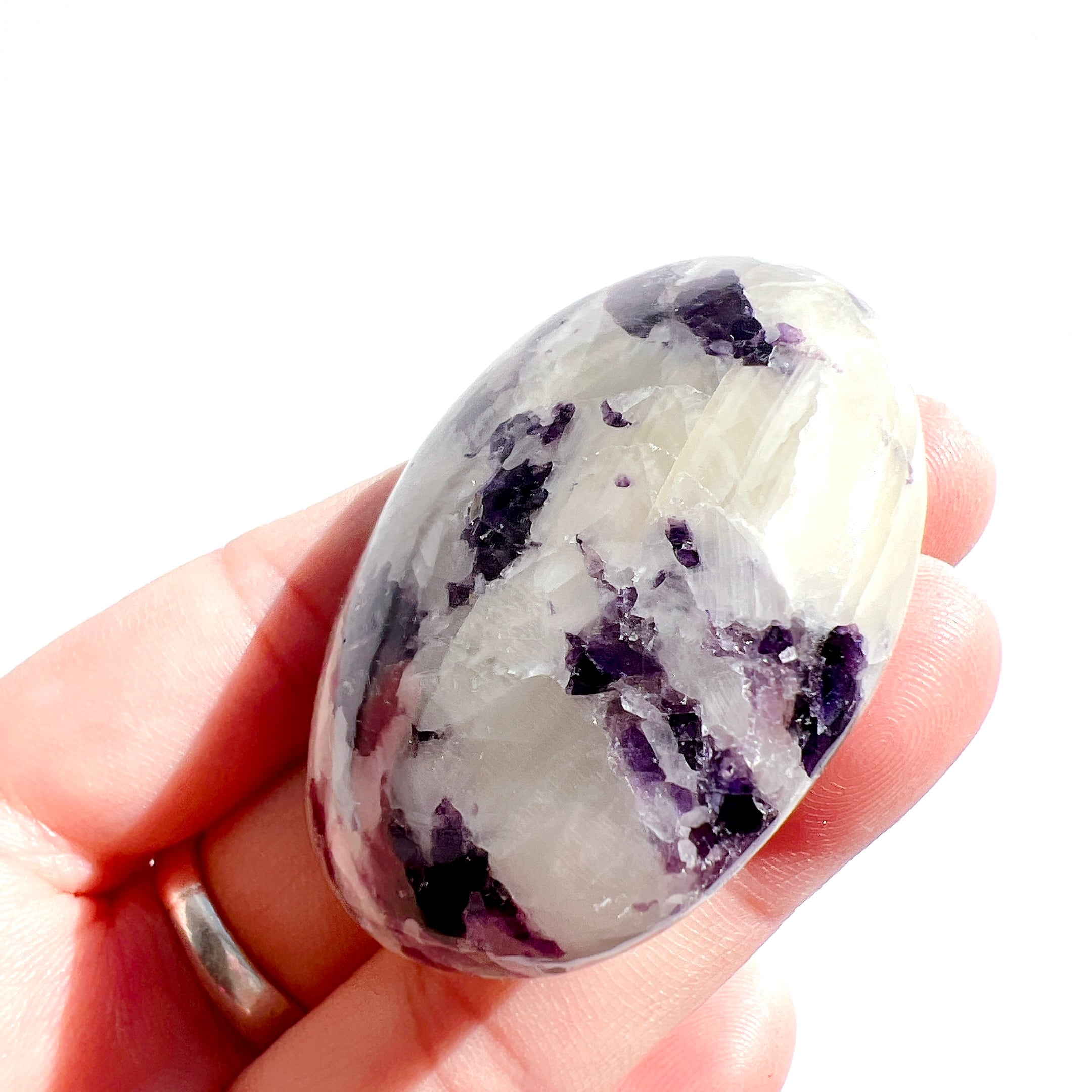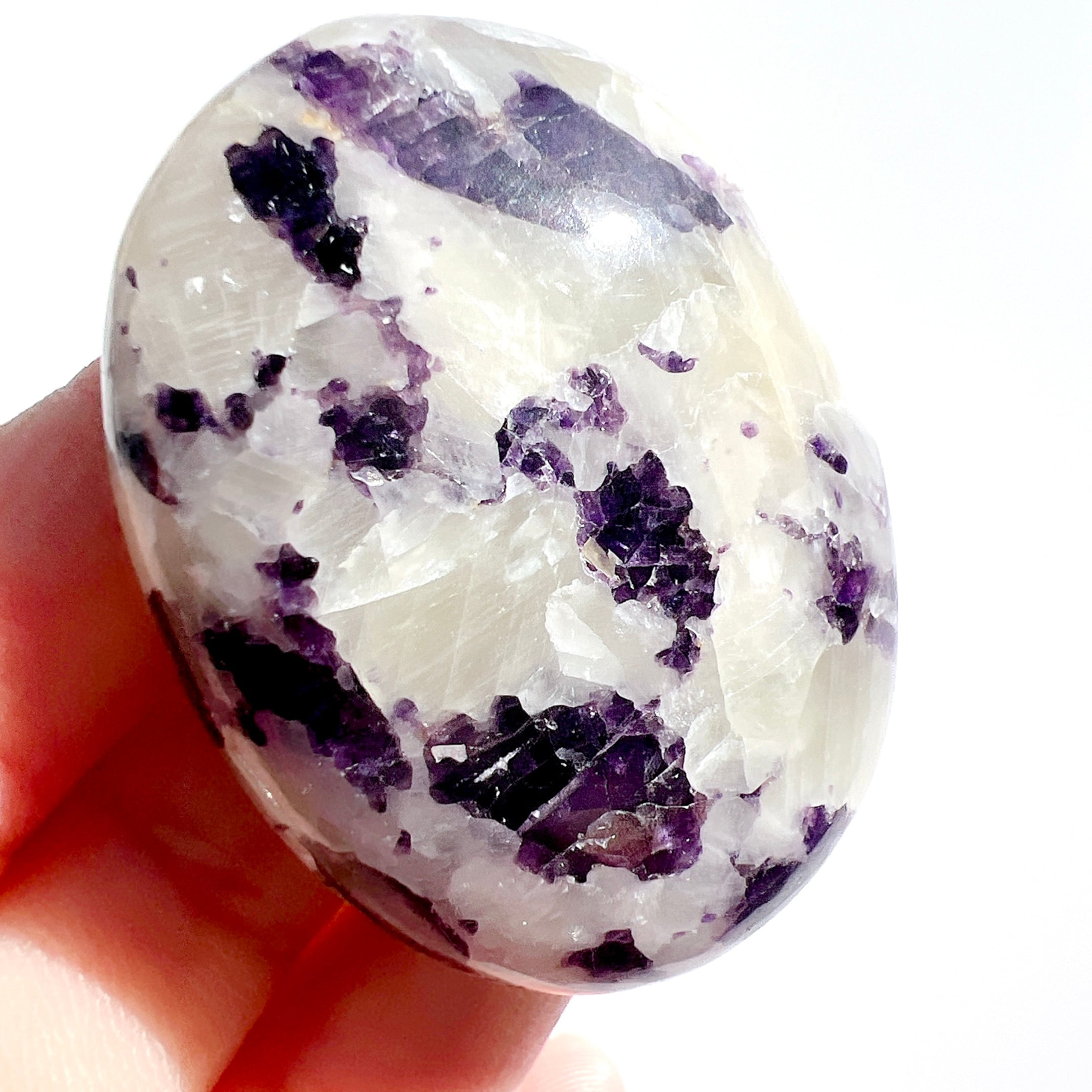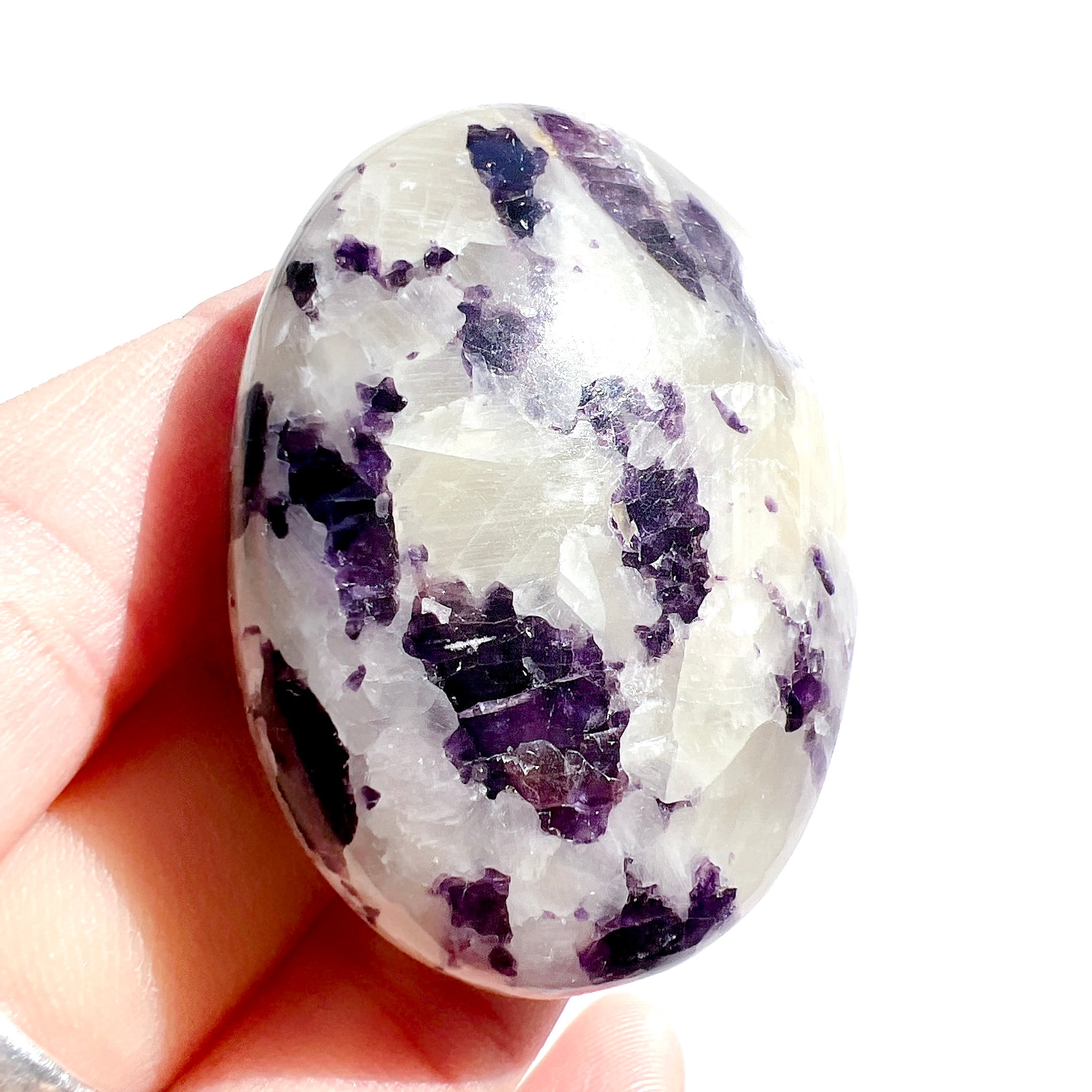 紫色のフローライトと、やわらかなホワイトカラーのカルサイトがひとつの石の中で共存する、めずらしいペプル型の天然石です。
