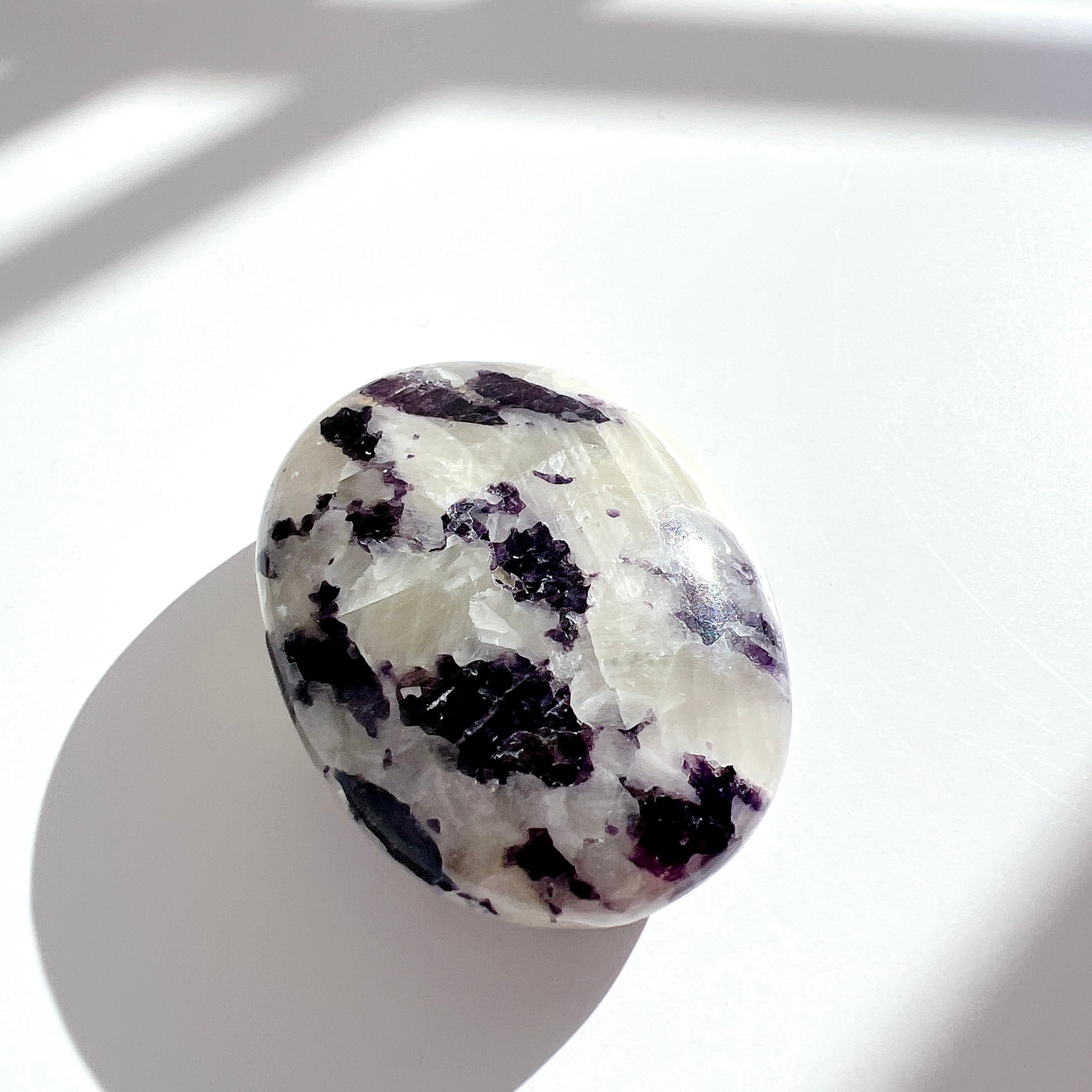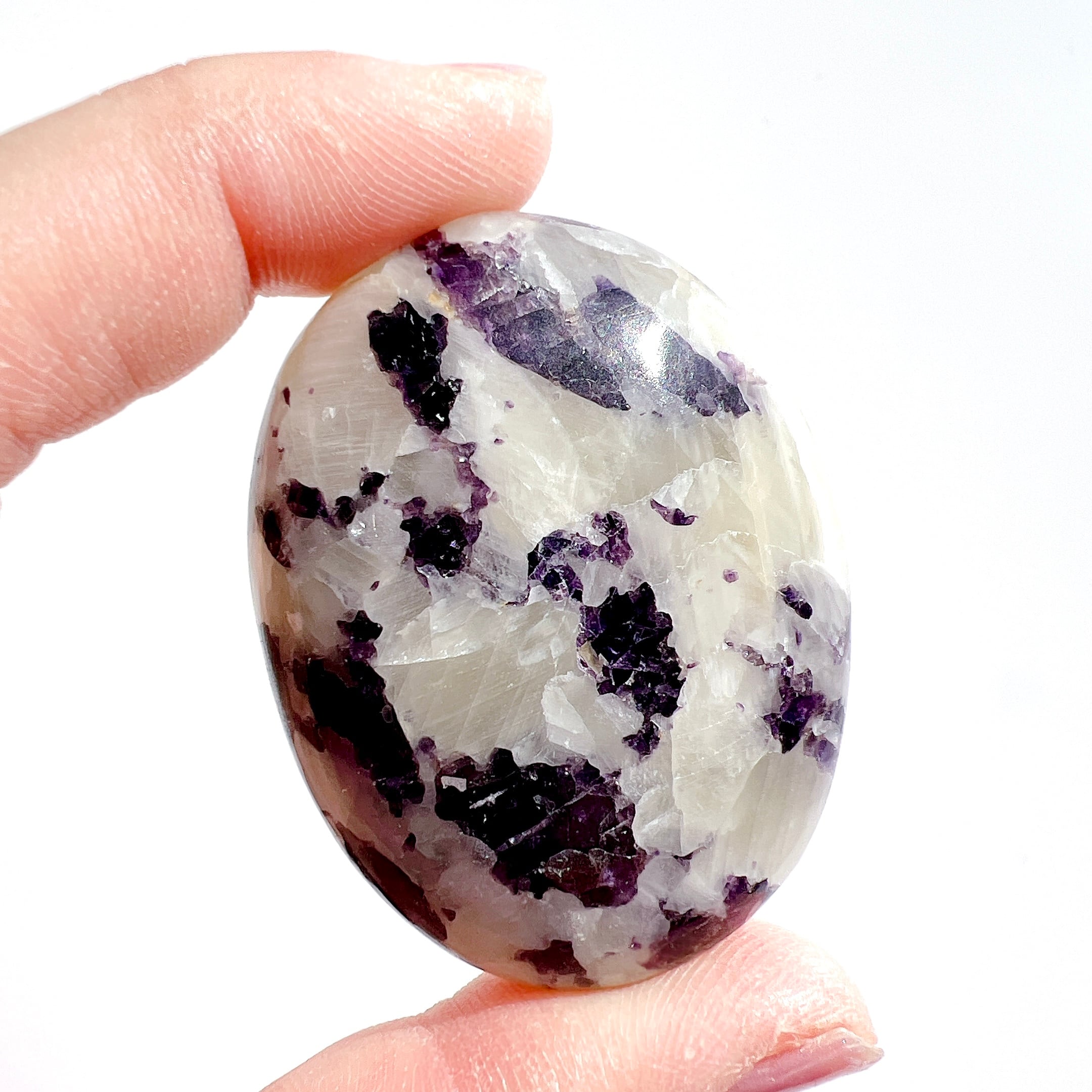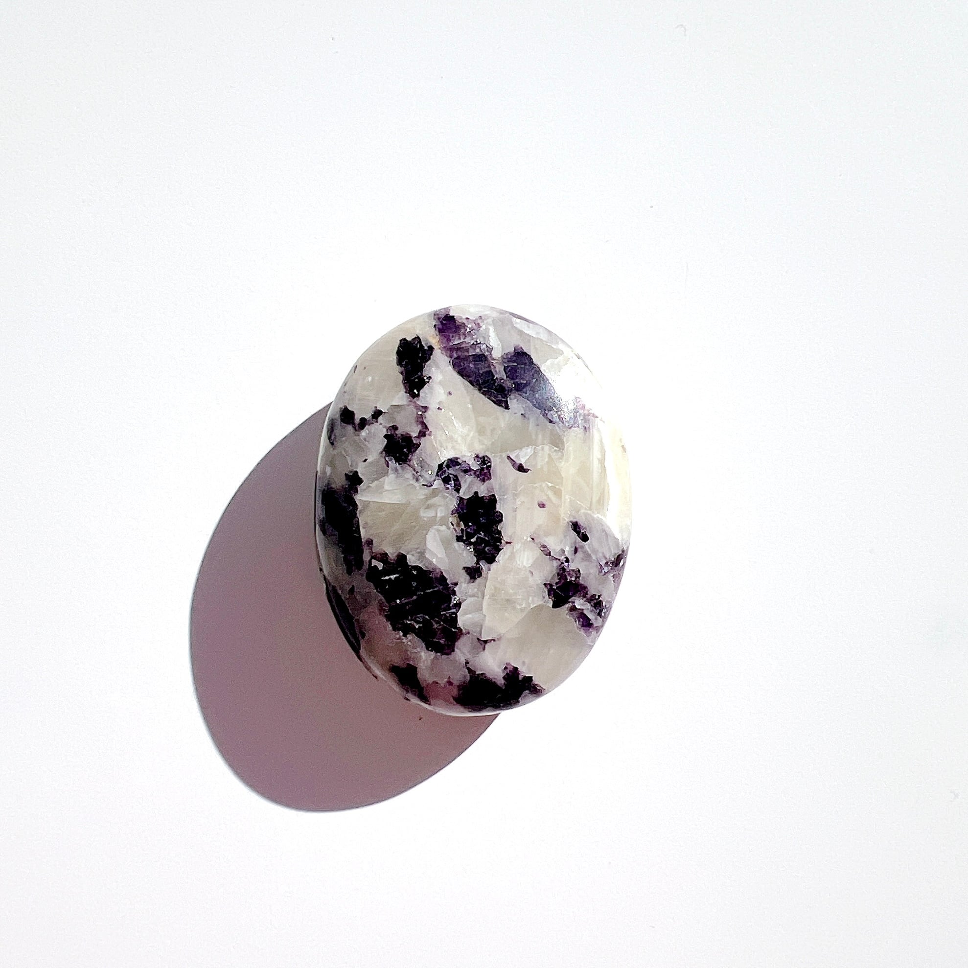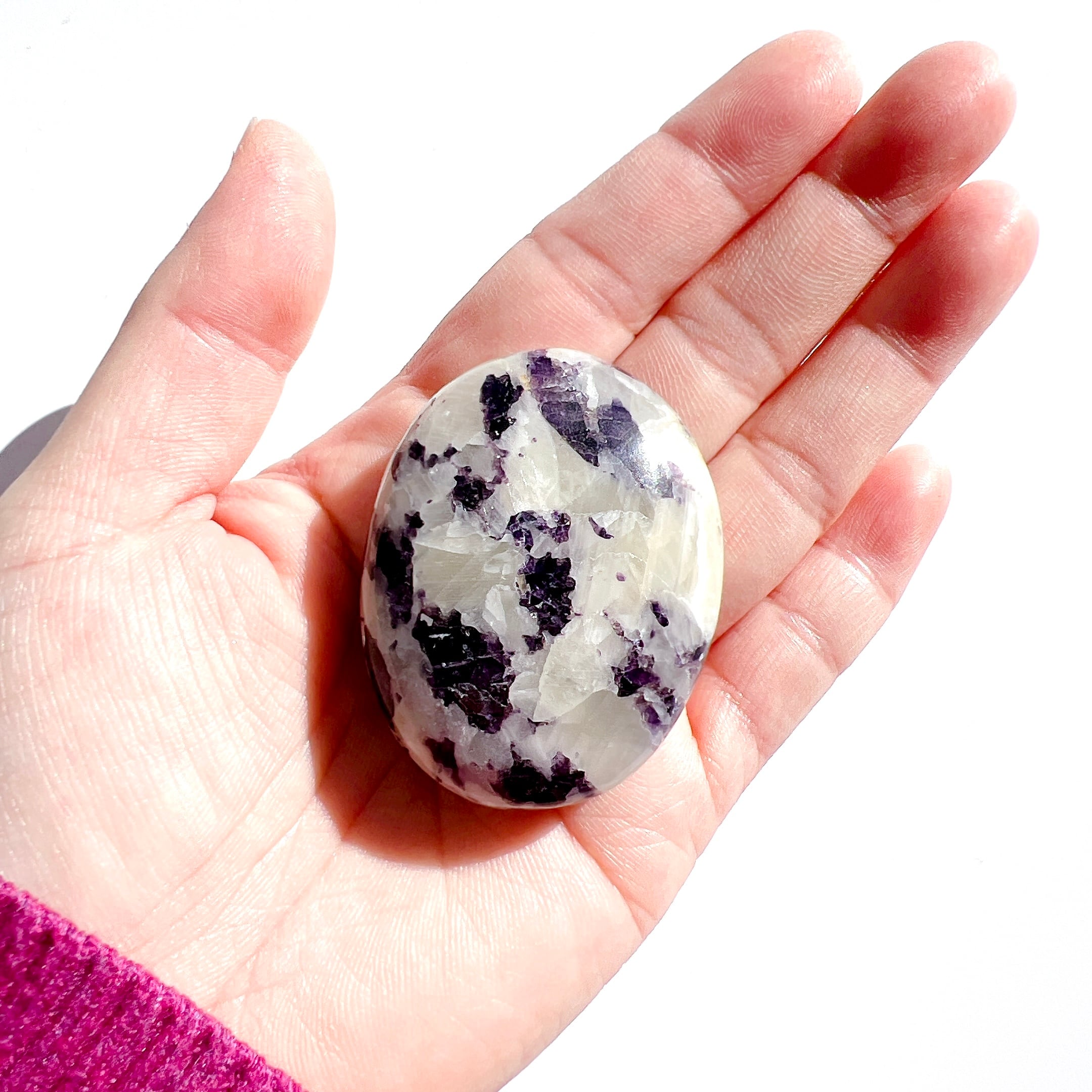 紫色のフローライトと、やわらかなホワイトカラーのカルサイトがひとつの石の中で共存する、めずらしいペプル型の天然石です。