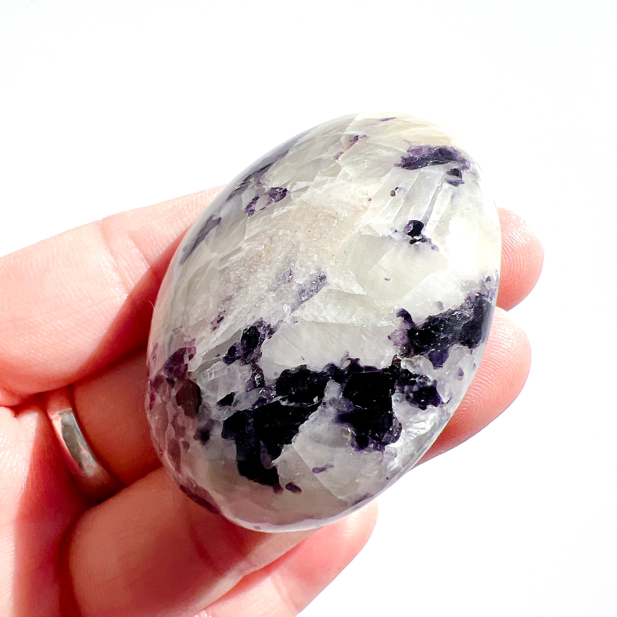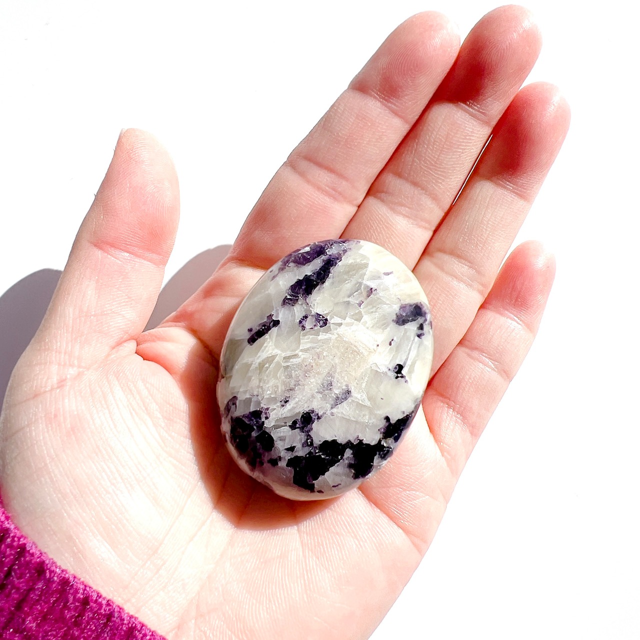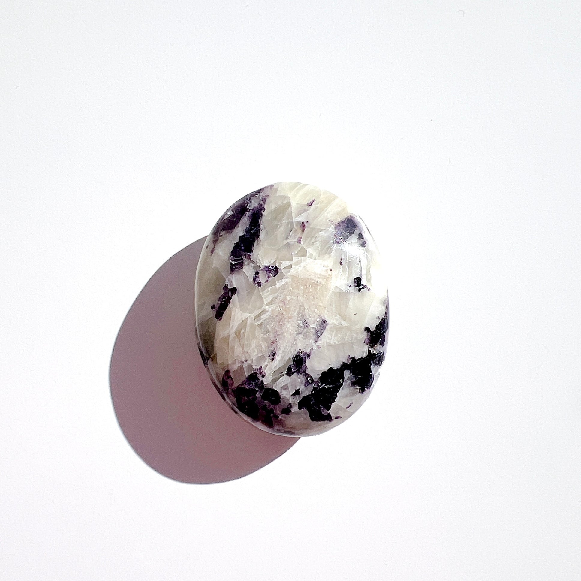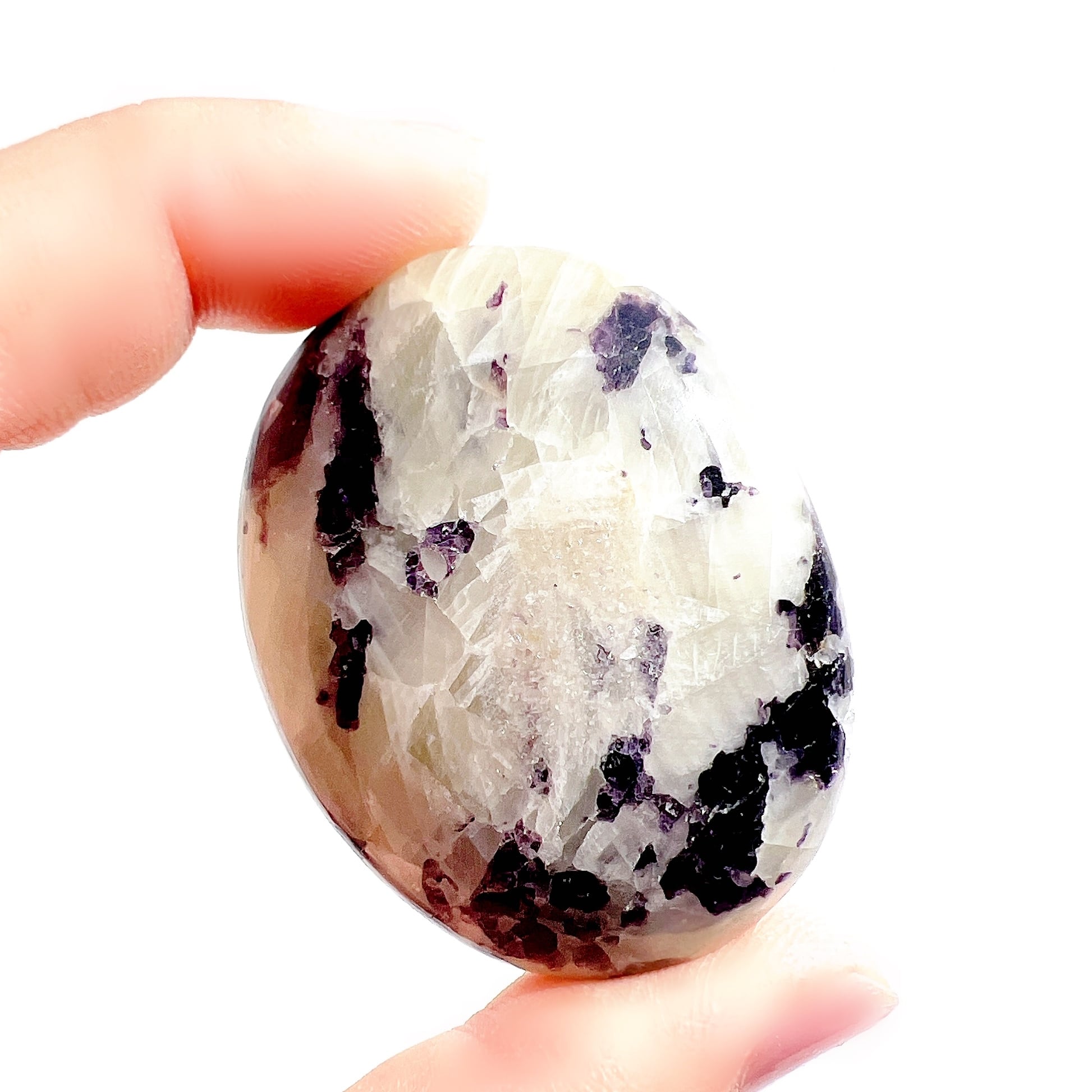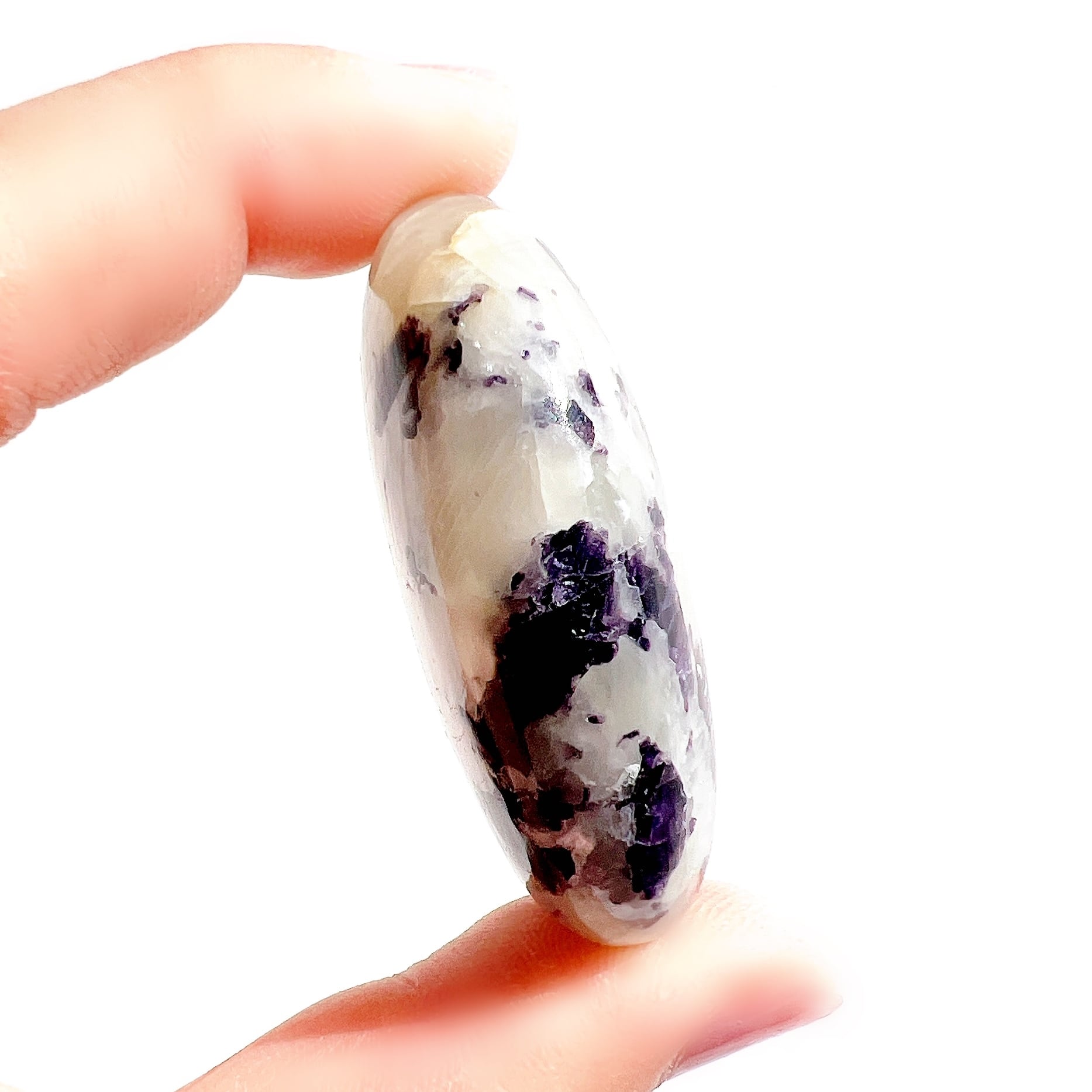 紫色のフローライトと、やわらかなホワイトカラーのカルサイトがひとつの石の中で共存する、めずらしいペプル型の天然石です。