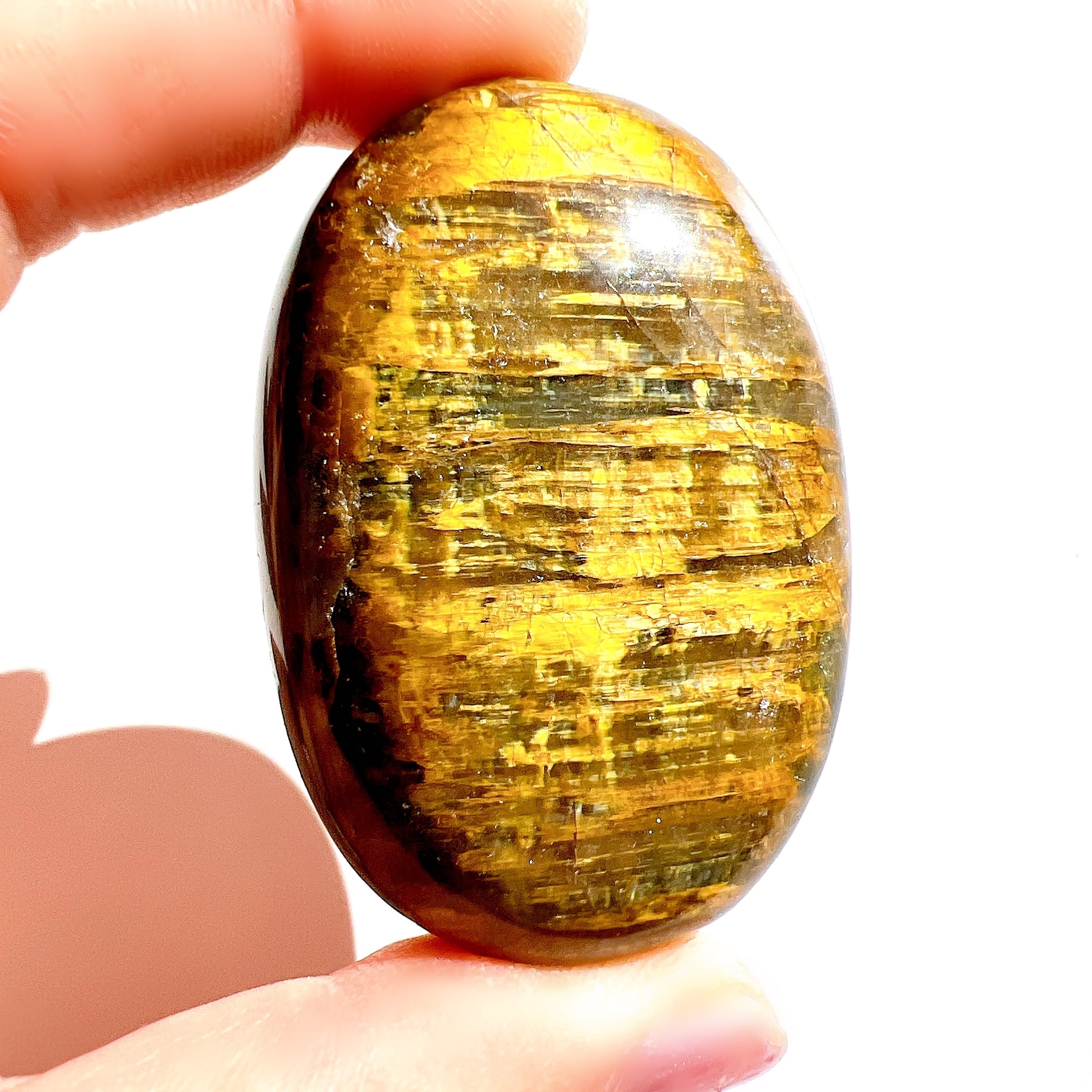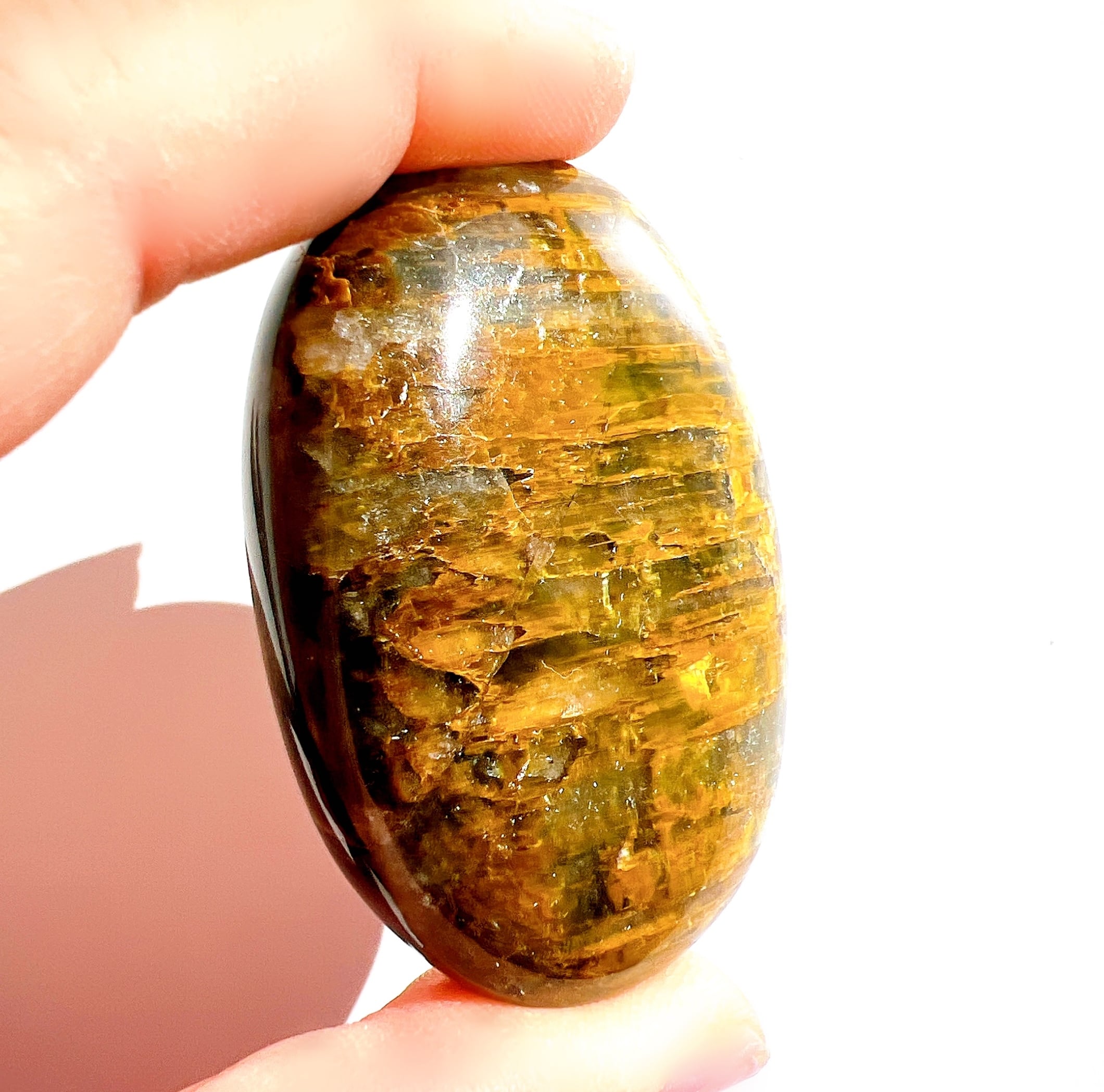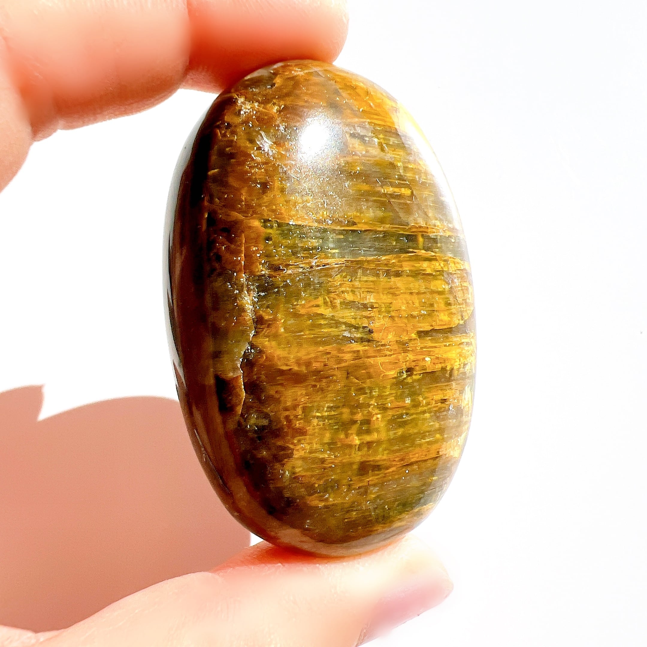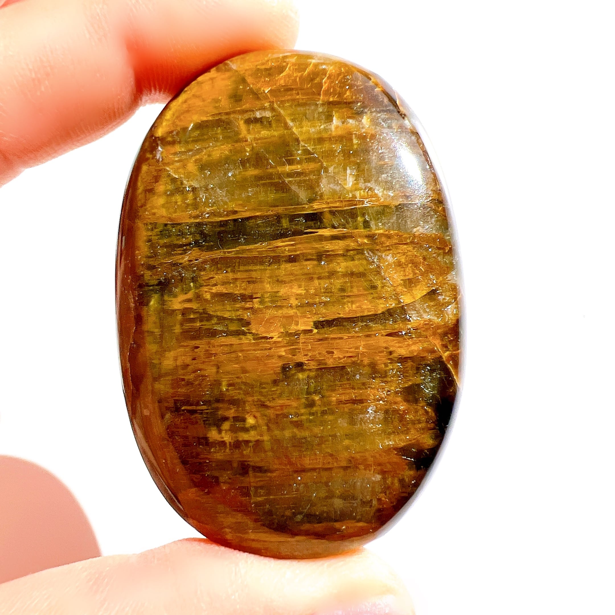 別名「ハニーストーン」とも呼ばれ、繊維状のクロシドライトに石英が入り込み、鉄分の酸化によって、青、黄色、赤へと表情を変える、奥深い輝きが特徴です。