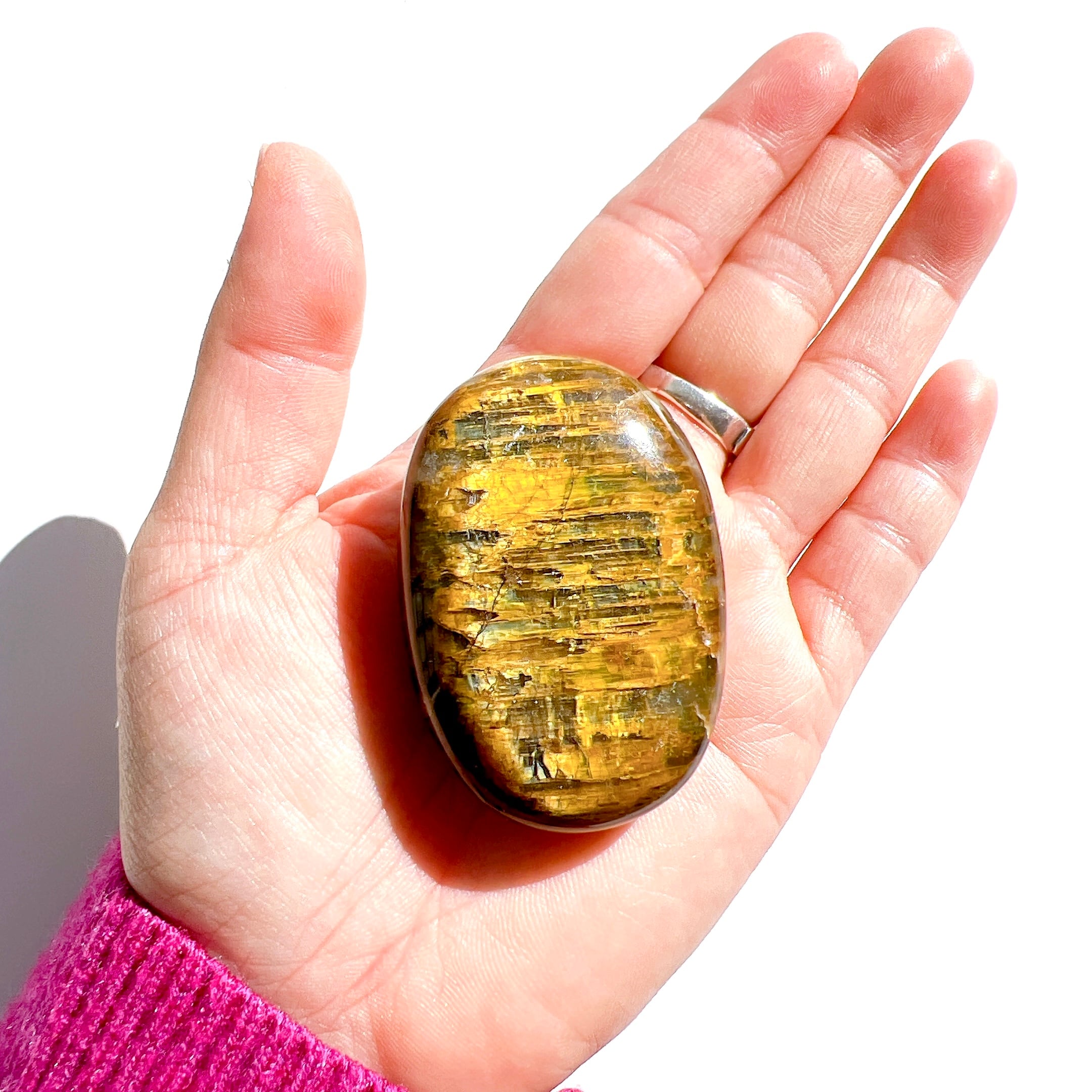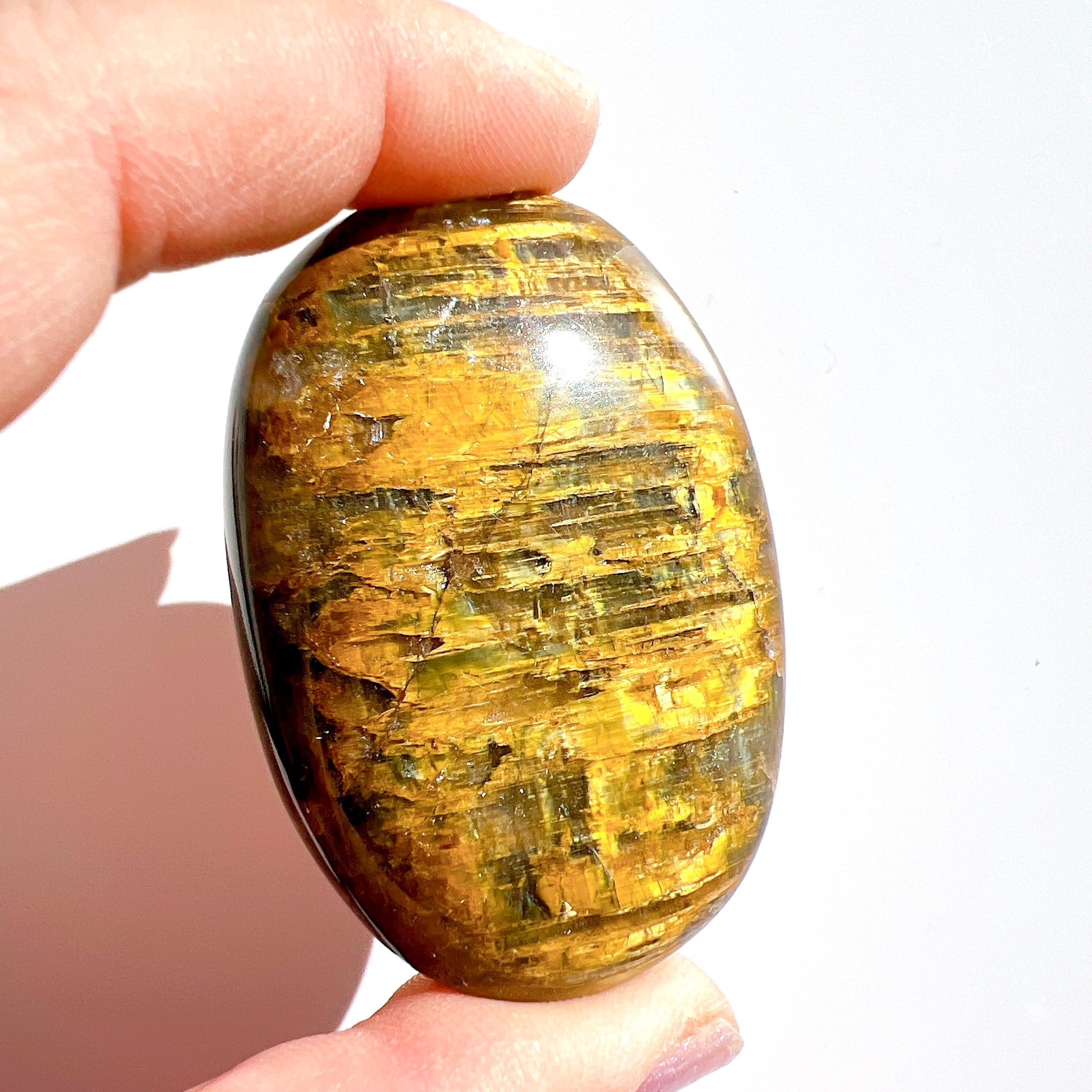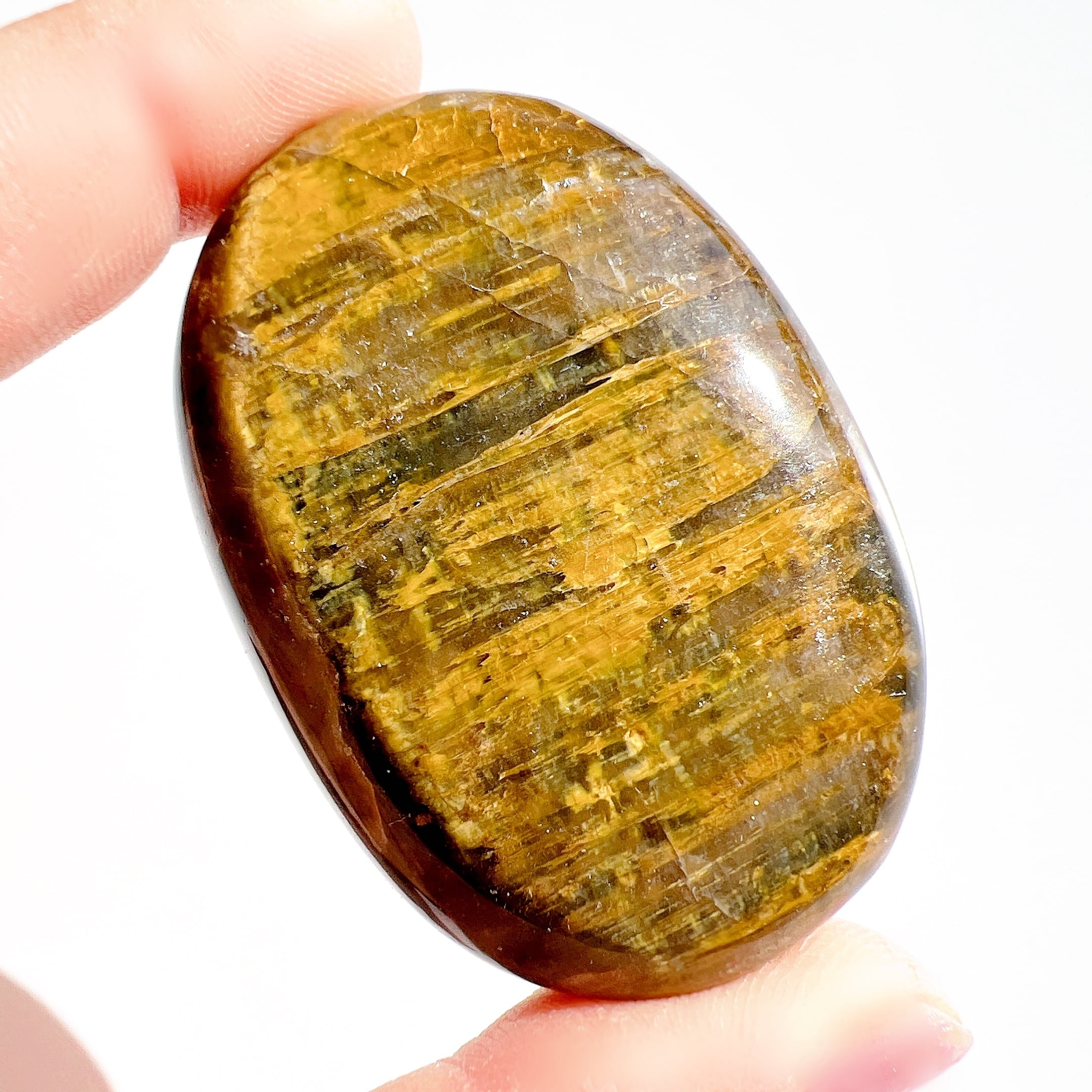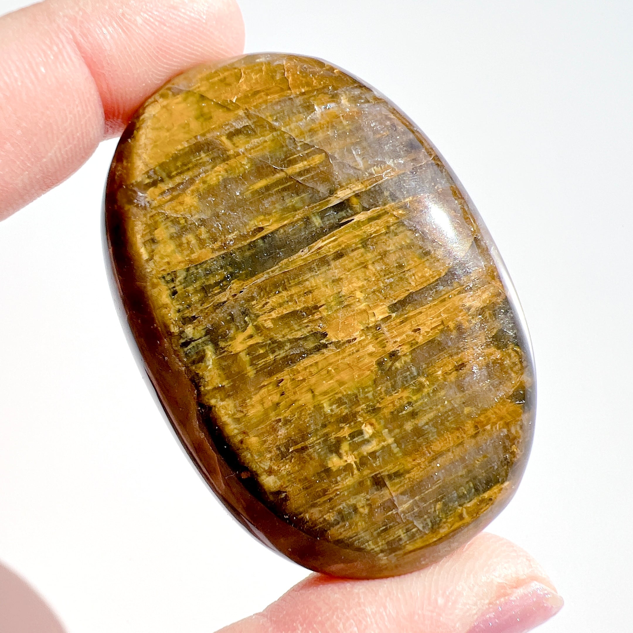 別名「ハニーストーン」とも呼ばれ、繊維状のクロシドライトに石英が入り込み、鉄分の酸化によって、青、黄色、赤へと表情を変える、奥深い輝きが特徴です。