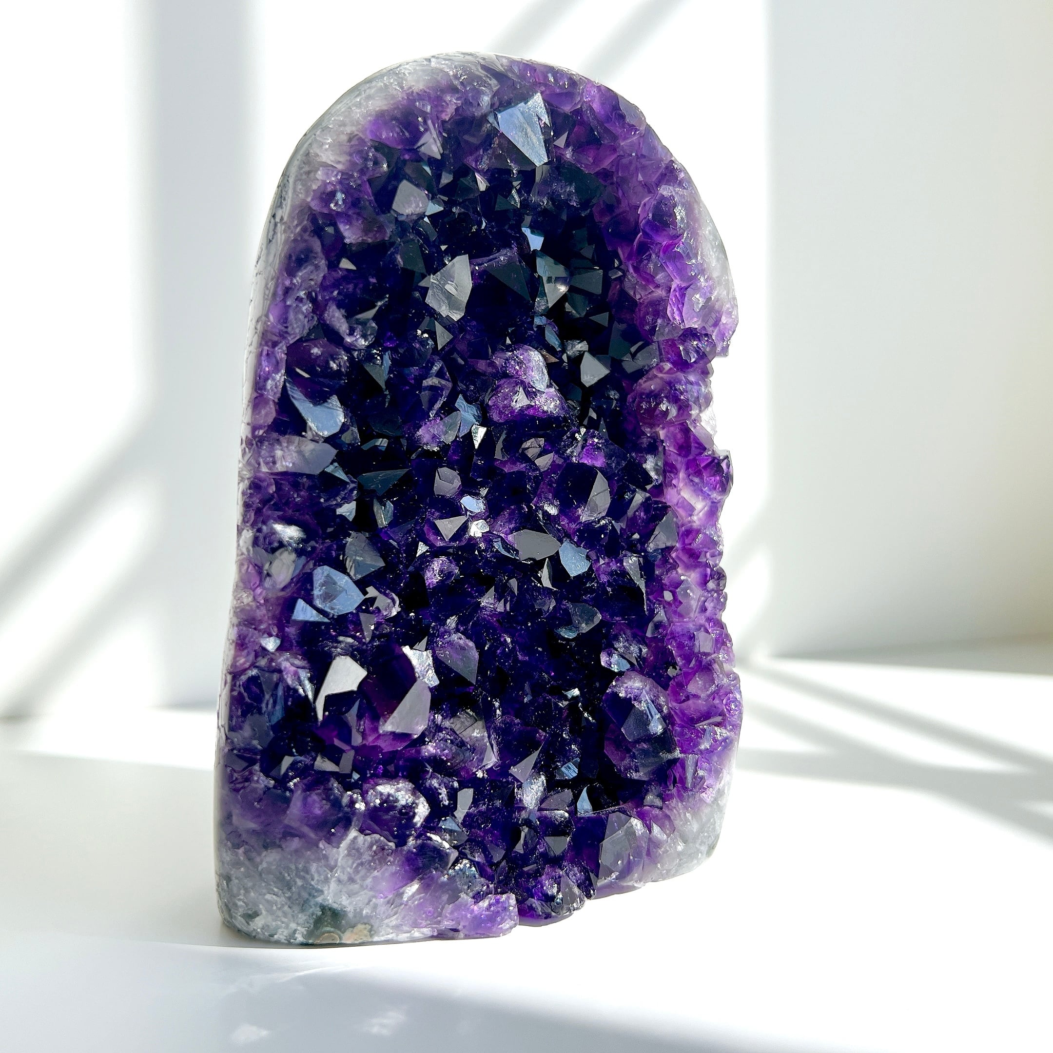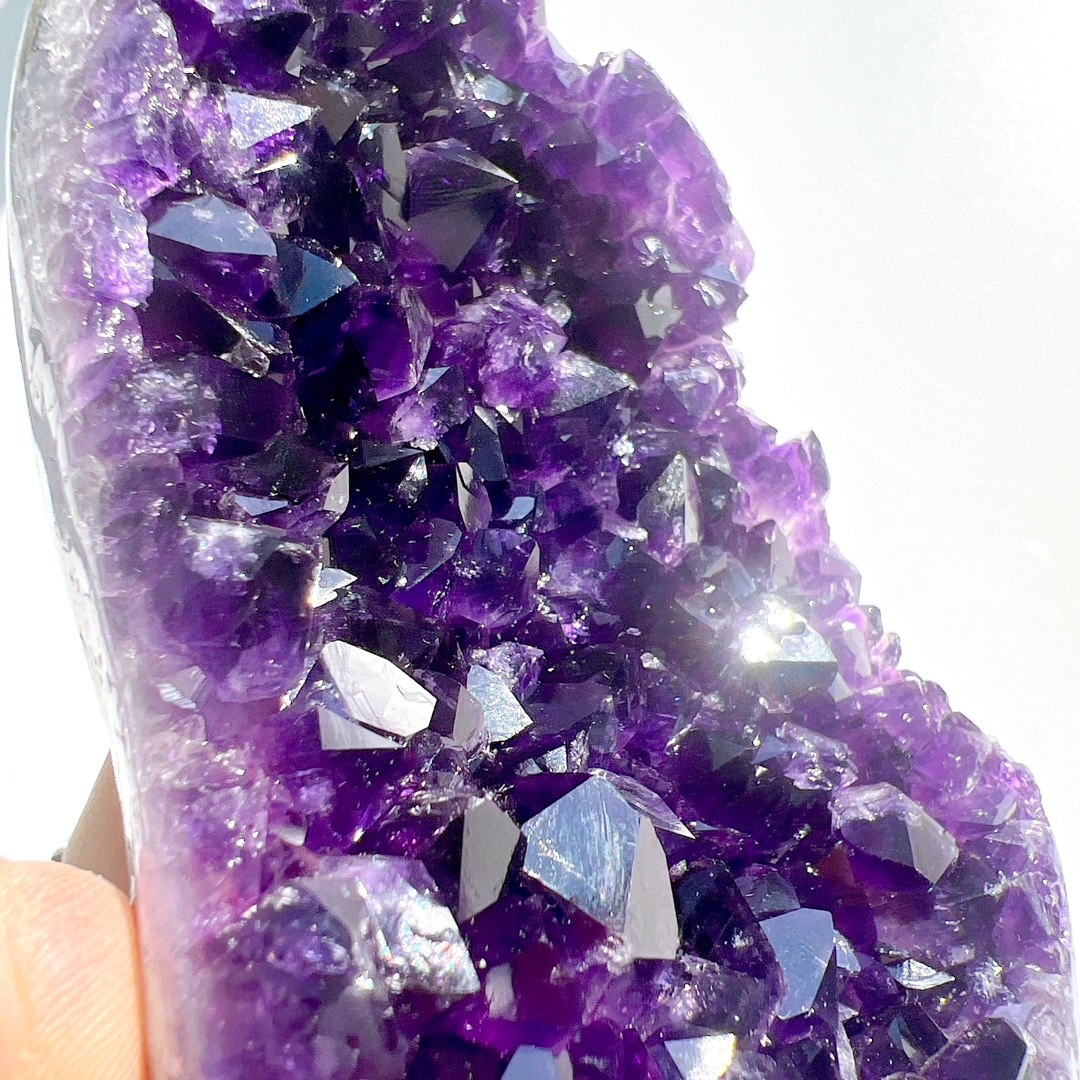 側面と底を丁寧に磨いているアメジストの原石です。結晶がキラキラとしてとても美しいです。