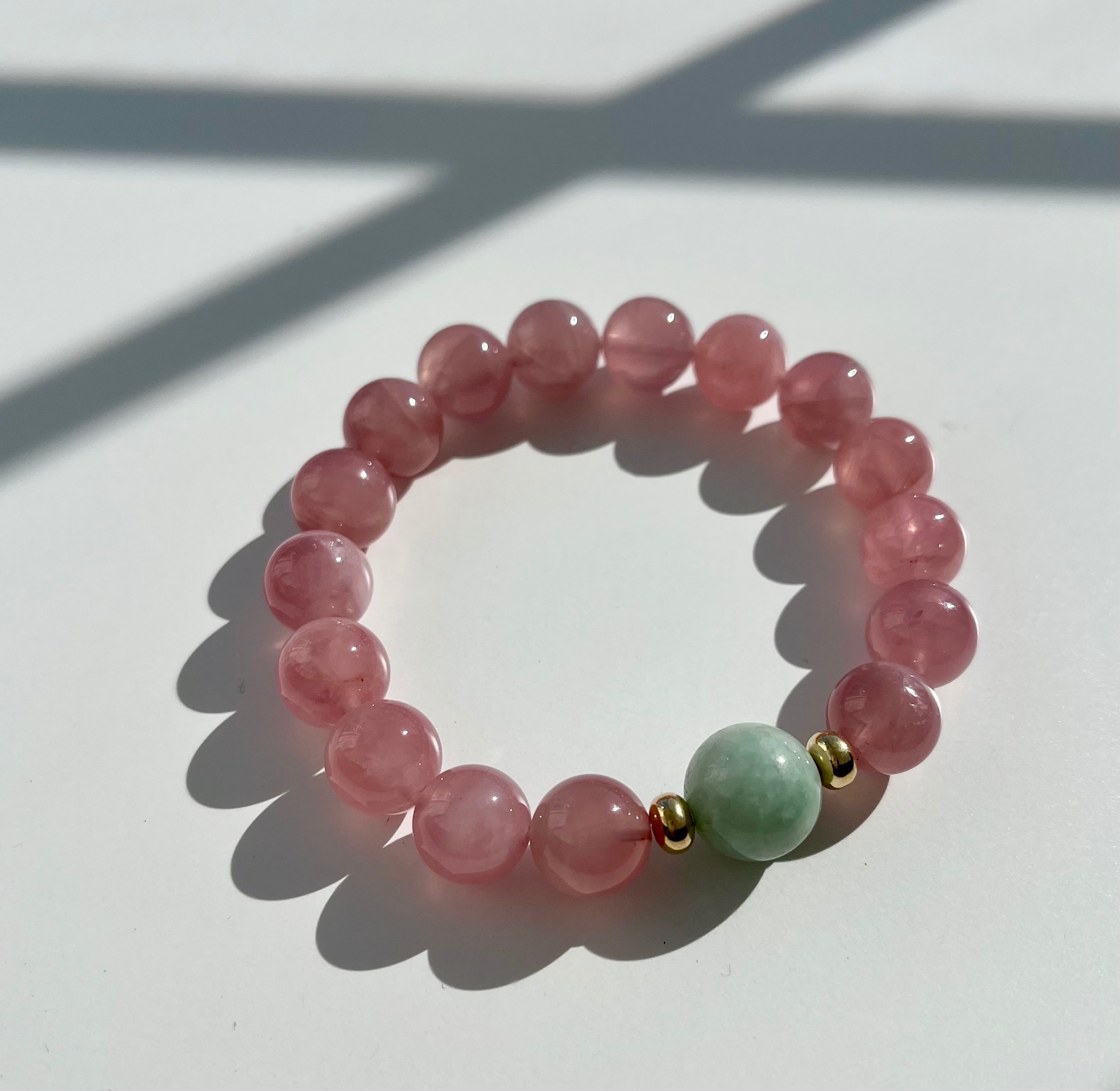 シンプルビューティーブレスシリーズ~ディープローズクォーツ&ヒスイ~は、洗練されたデザインと美しい石の組み合わせが特徴です。ディープローズクォーツの透明感と輝き、そしてヒスイの自然な色合いが、上品で優雅な印象を与えます。